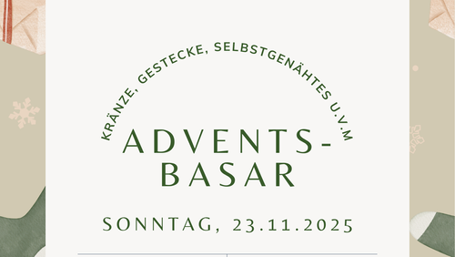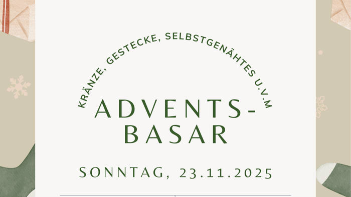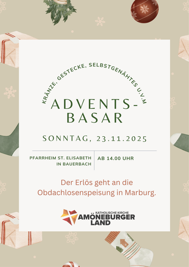 Am Sonntag, den 23.11.2025 findet ab 14:00 Uhr ein Adventsbasar im Pfarrheim Bauerbach statt. Der Erlös geht an die Obdachlosenspeisung in Marburg. Bei Kaffee, Kuchen, Plätzchen und Stollen können Sie adventliche Gestecke und Kränze sowie kleine Geschenke erwerben. Herzliche Einladung!