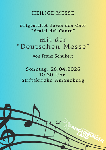 Am Sonntag, 26.04.2026 wird im Rahmen des Sonntagsgottesdienstes in der Stiftskirche die sog. "Deutsche Messe" von Franz Schubert (Schubert Messe) vom Chor "Amici del Canto" aus Dautphetal gesungen.