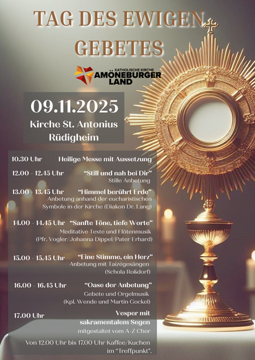 Am Sonntag, 09. November 2025 werden wir zum ersten Mal einen gemeinsamen Tag des Ewigen Gebetes in unserer Pfarrei St. Bonifatius Amöneburger Land anbieten. Dadurch soll das gemeinsame Gebet vor dem ausgesetzten Allerheiligsten gefördert werden, da die ursprünglichen Gebetstage in den einzelnen Kirchorten in den letzten Jahren schwer oder gar nicht mehr zustande kamen.