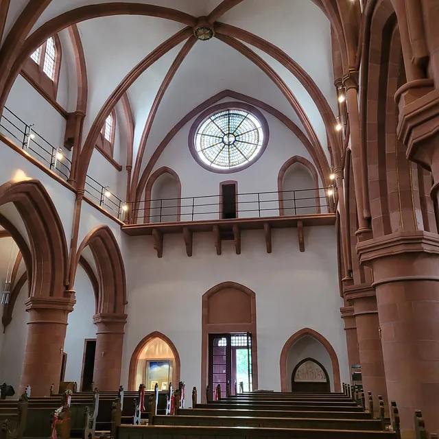 Diese Kirche, wie sie heute noch steht, ist eine neugotische Basilika mit Querschiff. Ursprünglich war der Innenraum farbenfroh gestaltet: Dekorbänder und Ornamente verzierten und umrahmten Säulen, Fenster und weitere Architekturelemente.