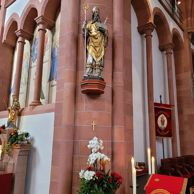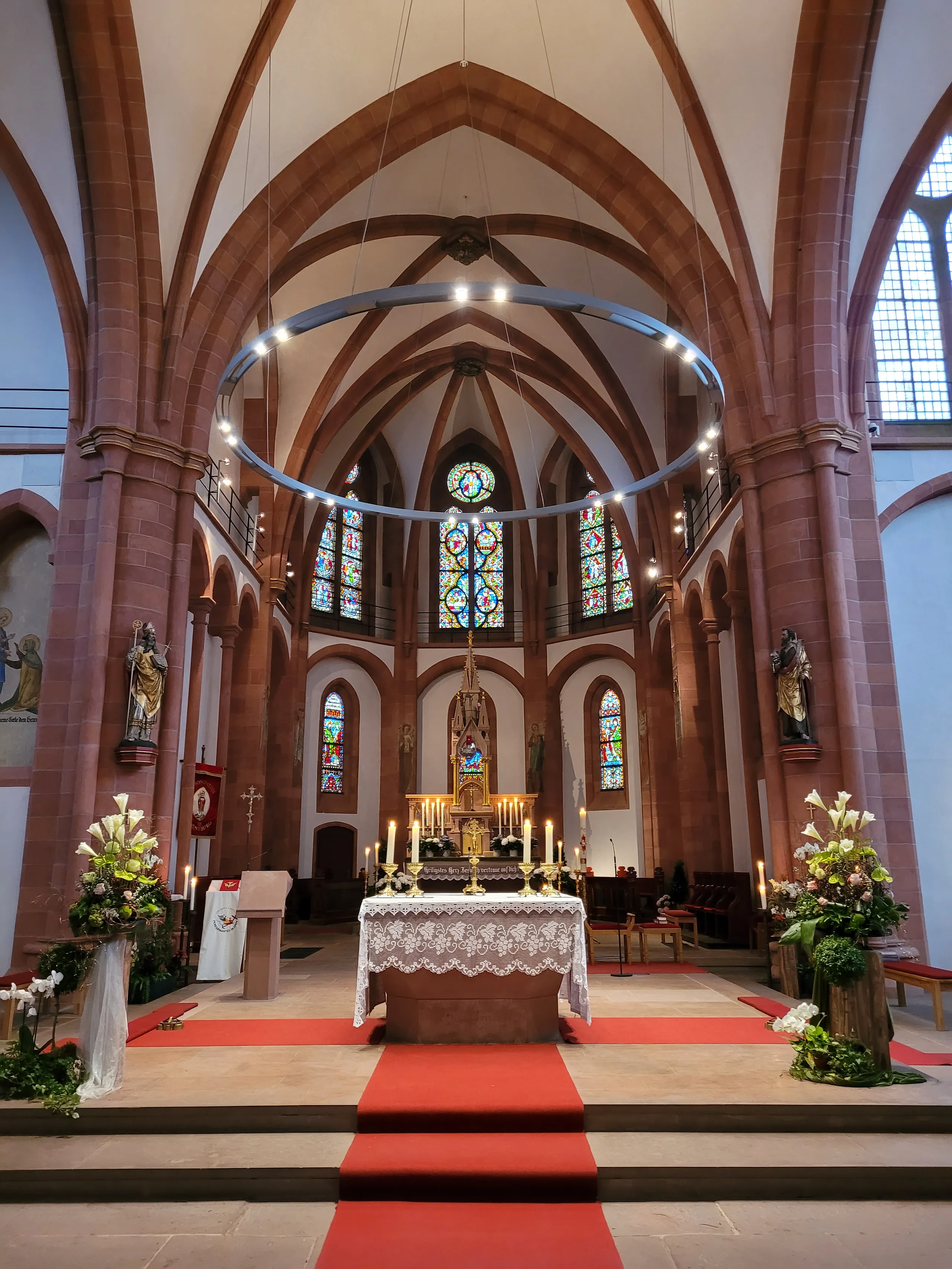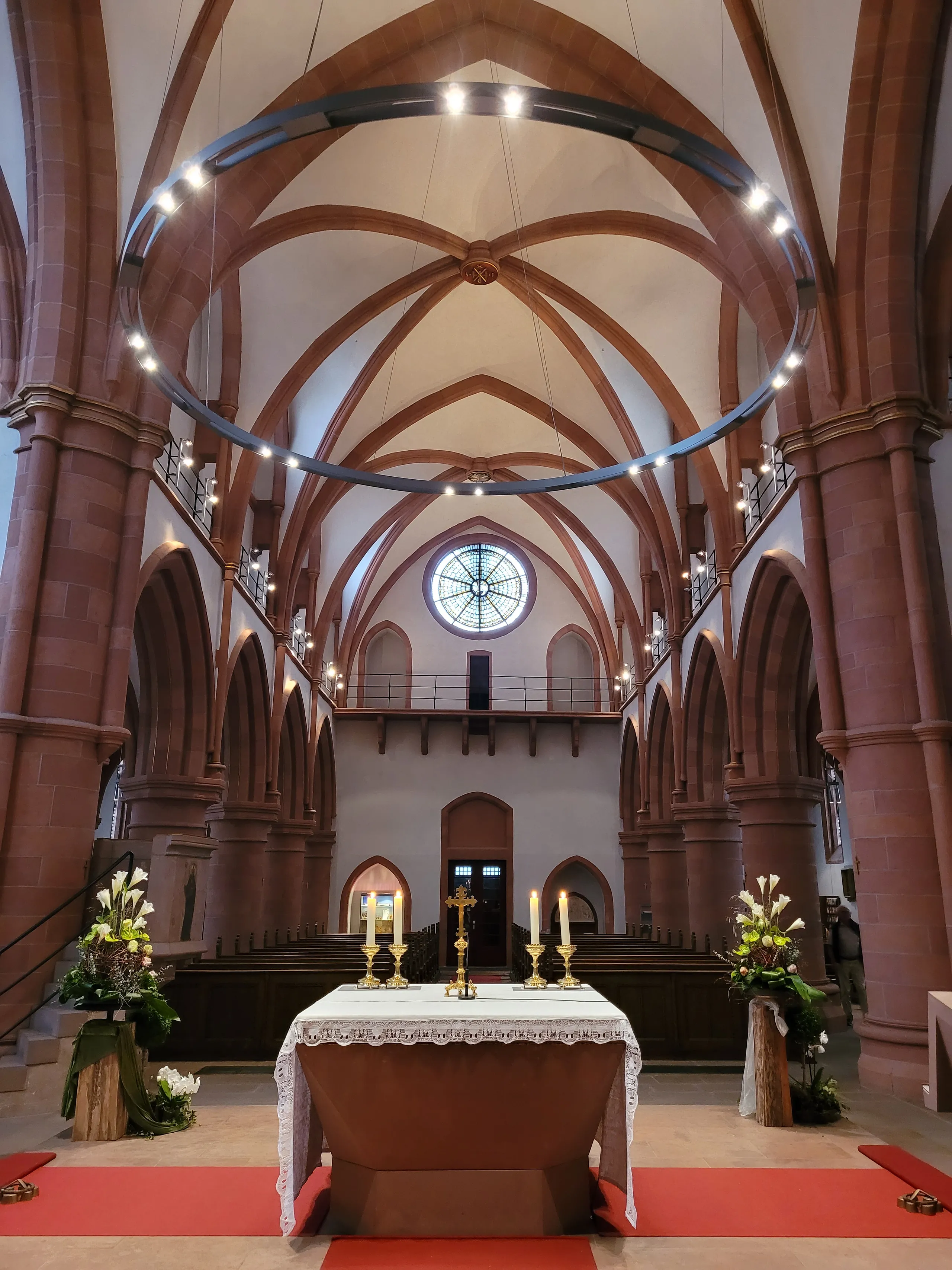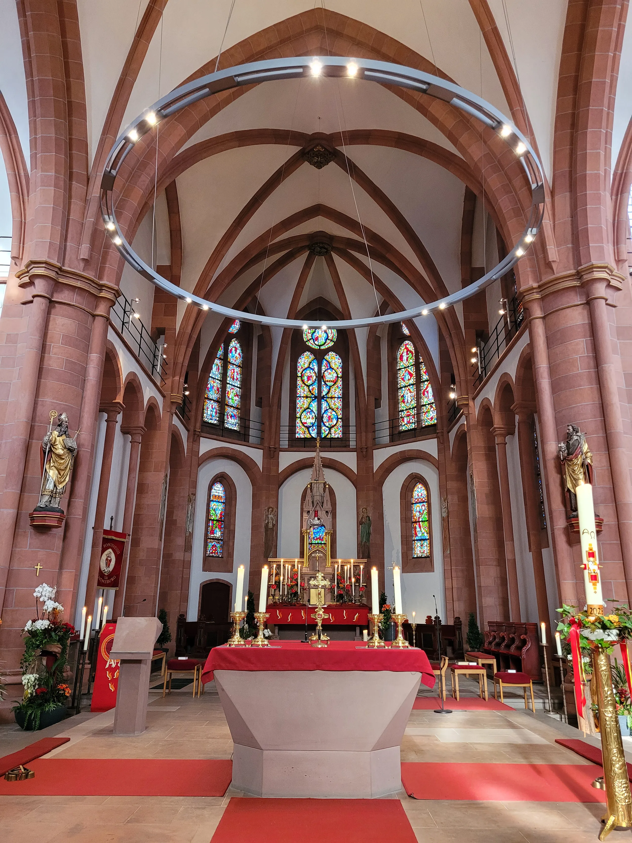 Der Altarraum, das Zentrum für den Gottesdienst, wurde durch einen Lichtkranz hervorgehoben, der einen Durchmesser von 4,50 m hat. Die beiden Figuren des Hl. Bonifatius und des Hl. Johannes d.T. haben Ihren ursprünglichen Platz links und rechts an den Säulen im Altarraum erhalten. Ebenso die Figur des Hl. Josef im rechten Querschiff. Die Wände und die Säulen wurden gereinigt und haben einen neuen Anstrich erhalten. Die Aufgänge an der Rückseite der Kirche, wie auch die 4 Nischen an der Rückwand wurden wieder freigelegt, nachdem sie 1933 zugemauert wurden.