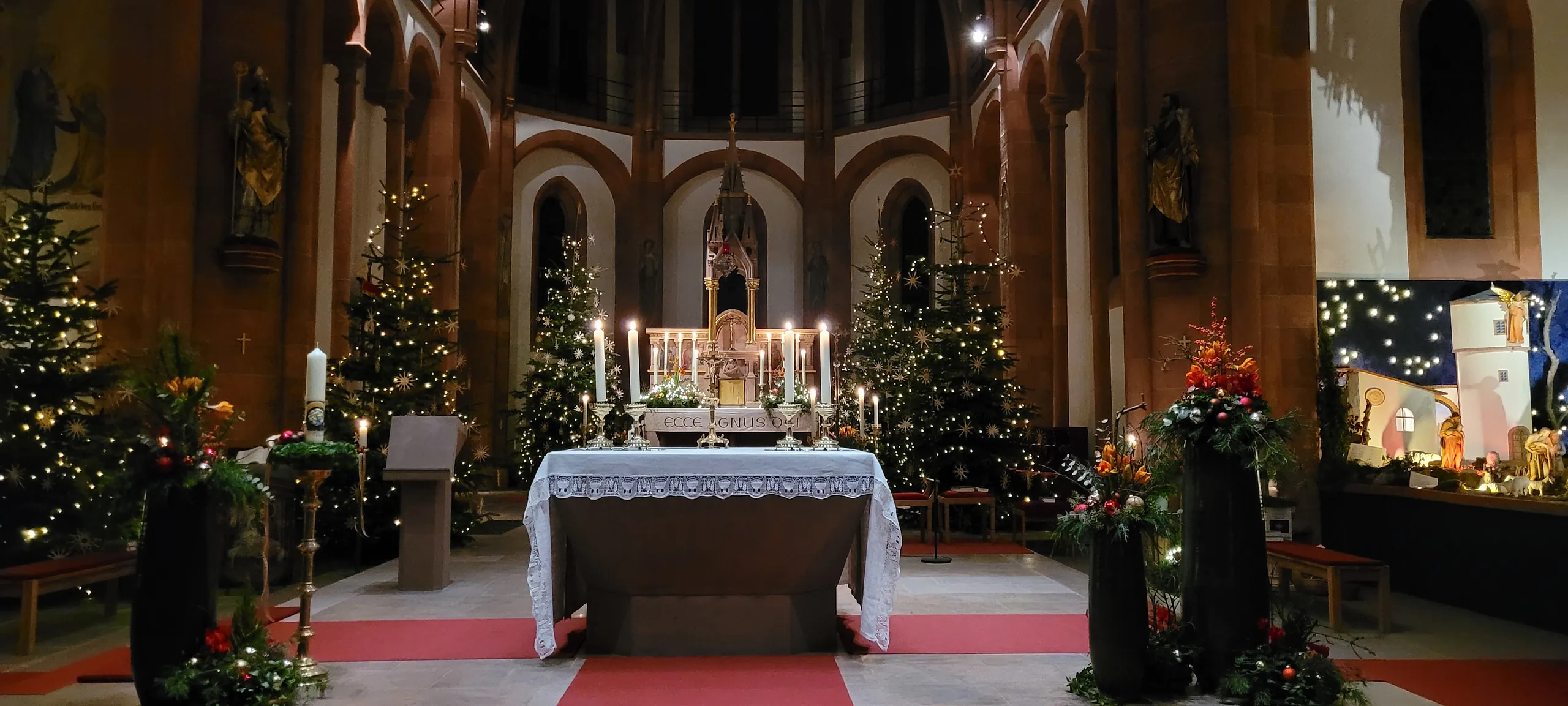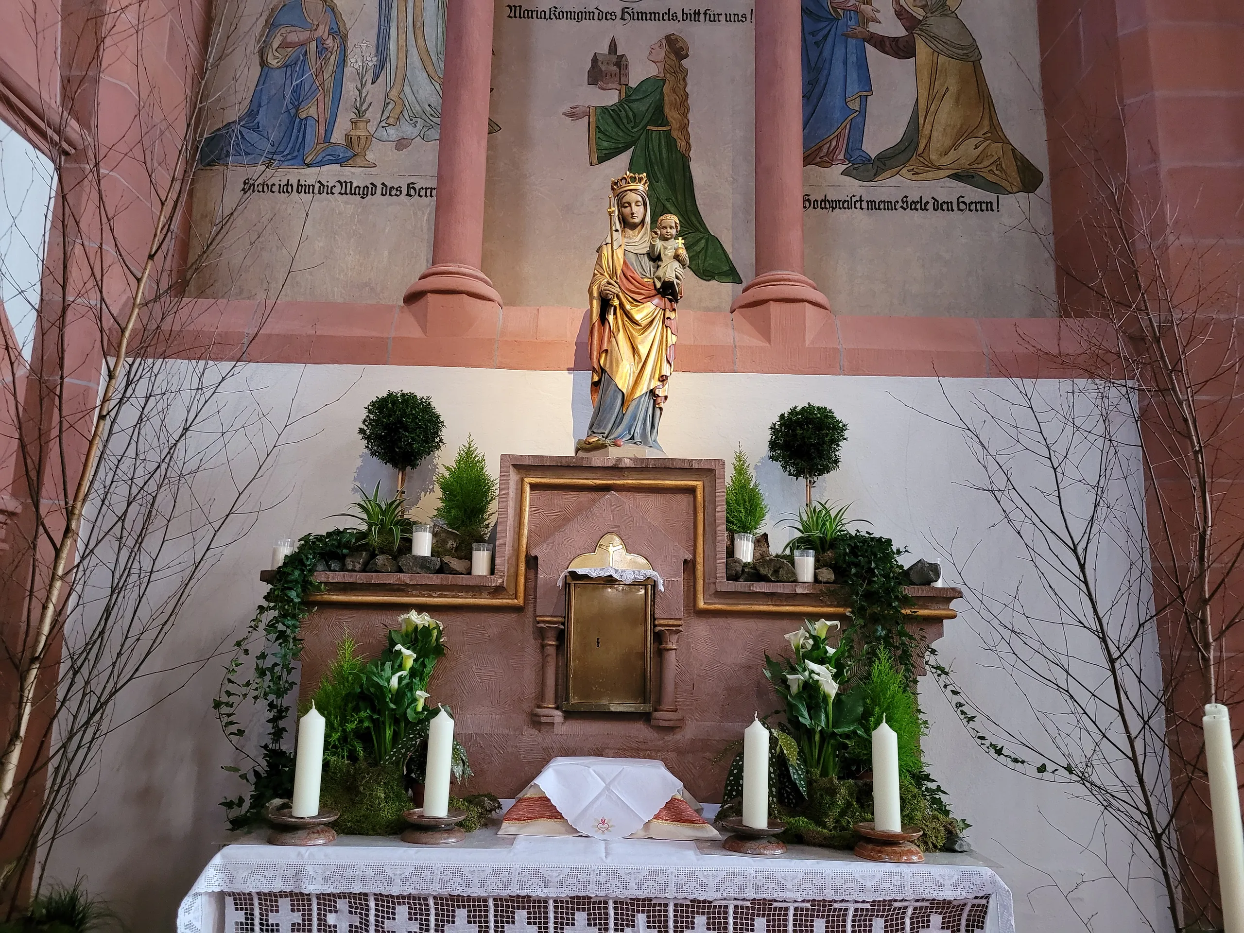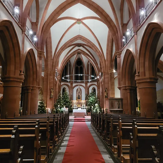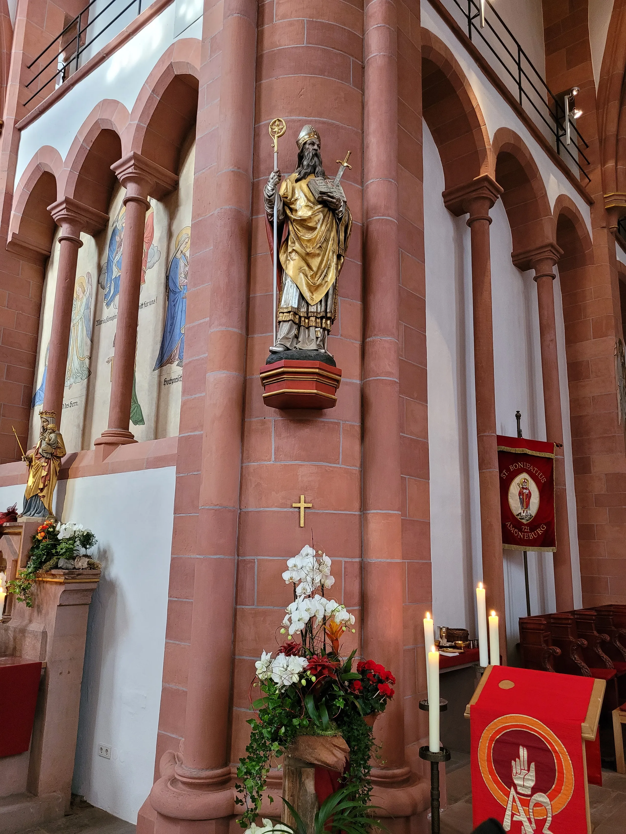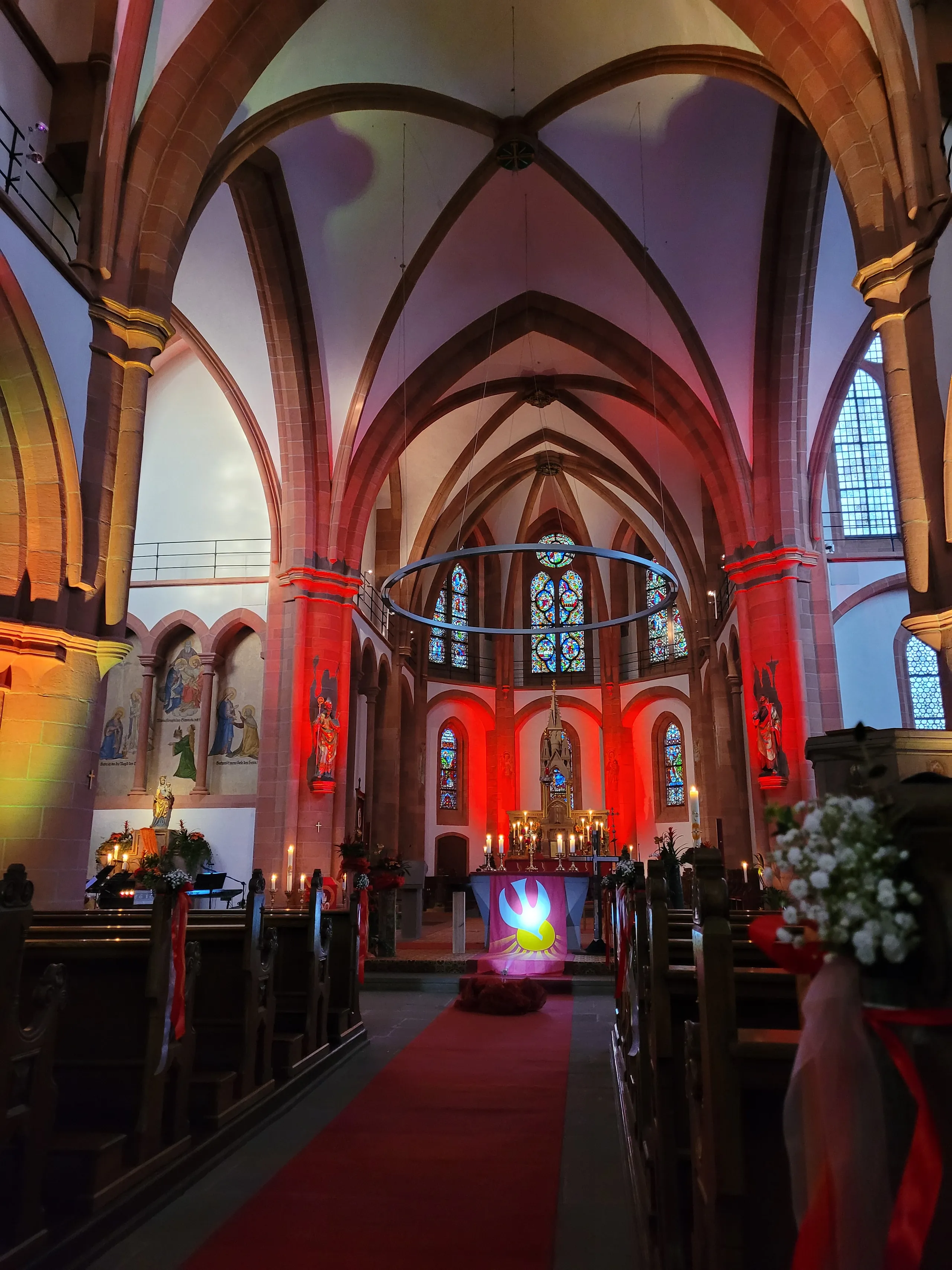 Der Altarraum, das Zentrum für den Gottesdienst, wurde durch einen Lichtkranz hervorgehoben, der einen Durchmesser von 4,50 m hat. Die beiden Figuren des Hl. Bonifatius und des Hl. Johannes d.T. haben Ihren ursprünglichen Platz links und rechts an den Säulen im Altarraum erhalten. Ebenso die Figur des Hl. Josef im rechten Querschiff. Die Wände und die Säulen wurden gereinigt und haben einen neuen Anstrich erhalten. Die Aufgänge an der Rückseite der Kirche, wie auch die 4 Nischen an der Rückwand wurden wieder freigelegt, nachdem sie 1933 zugemauert wurden.