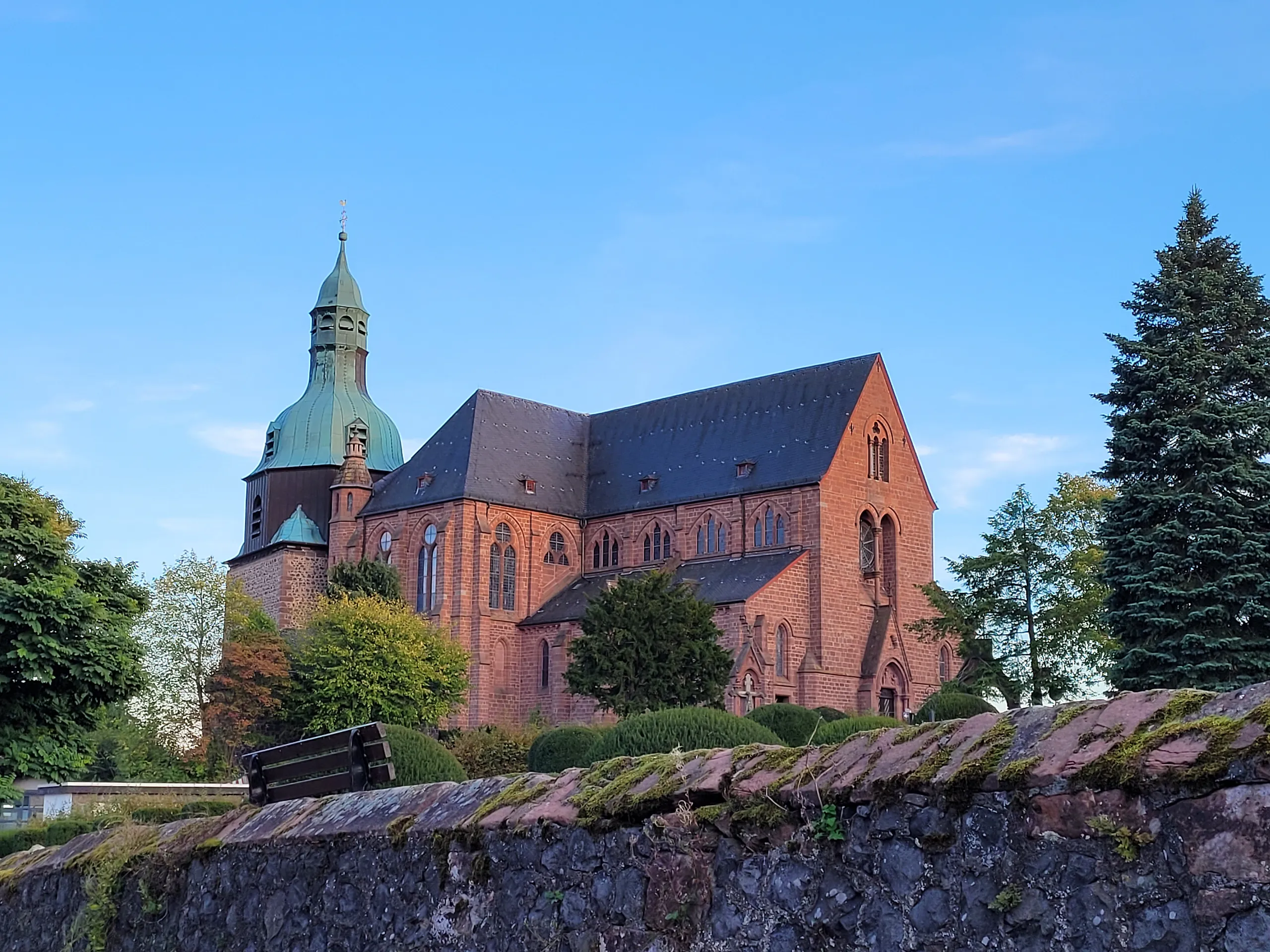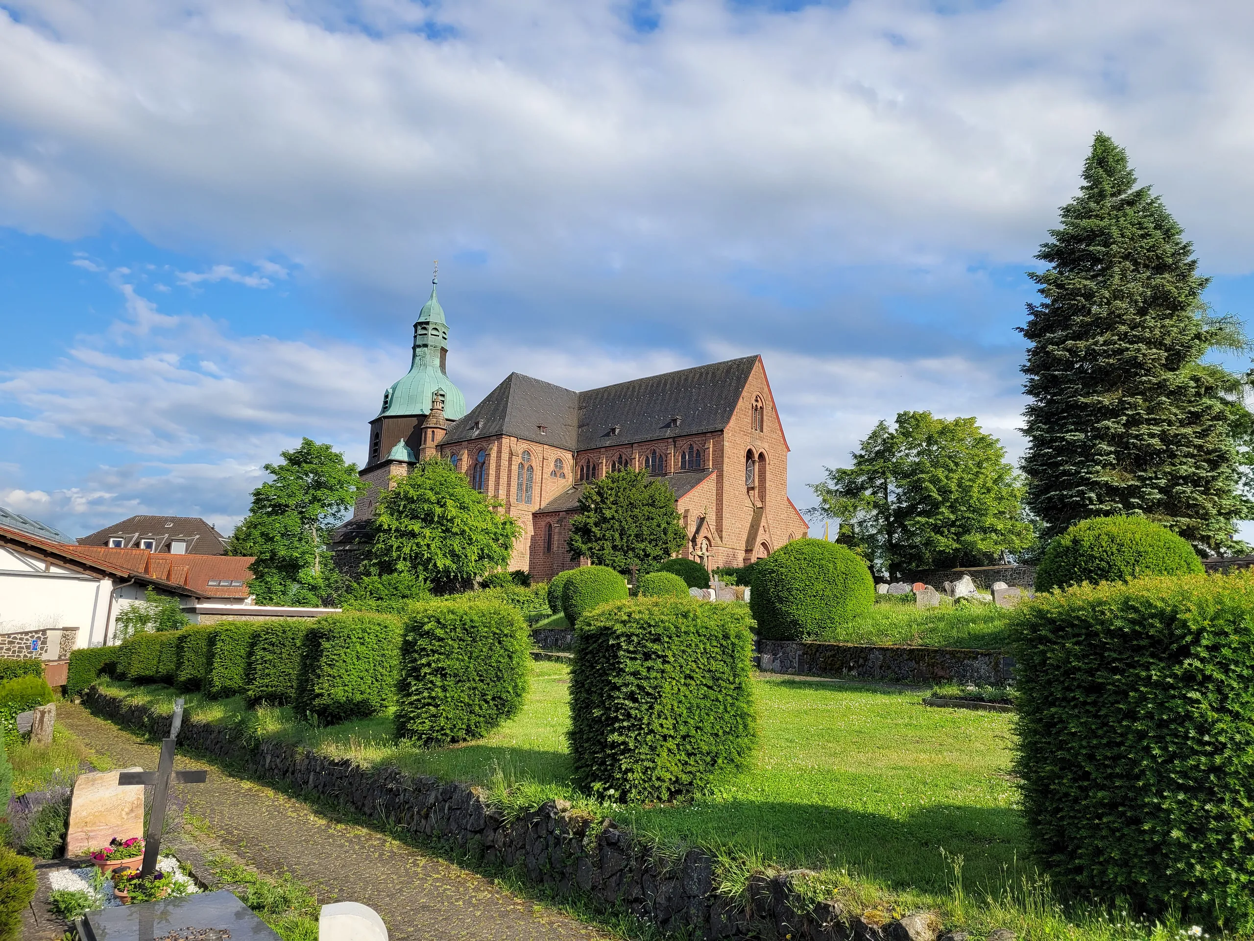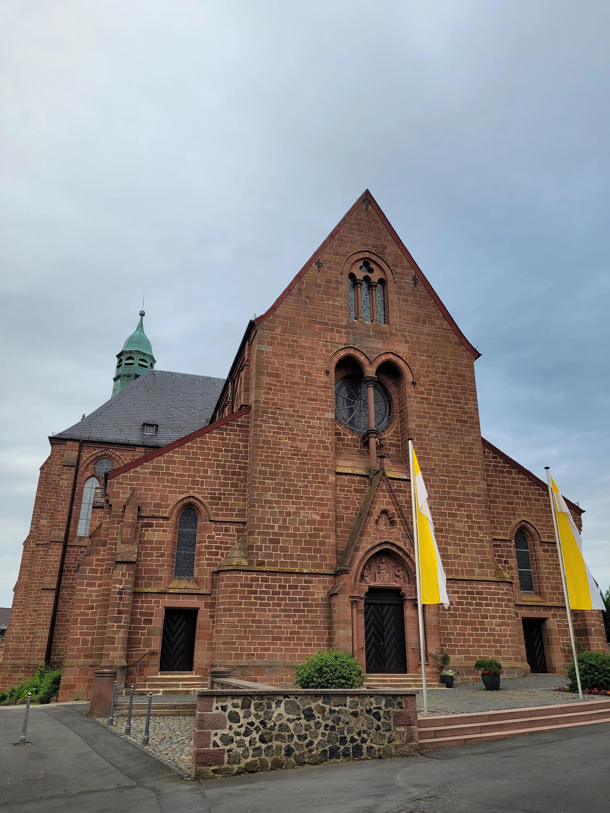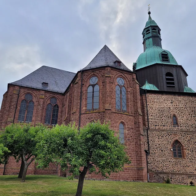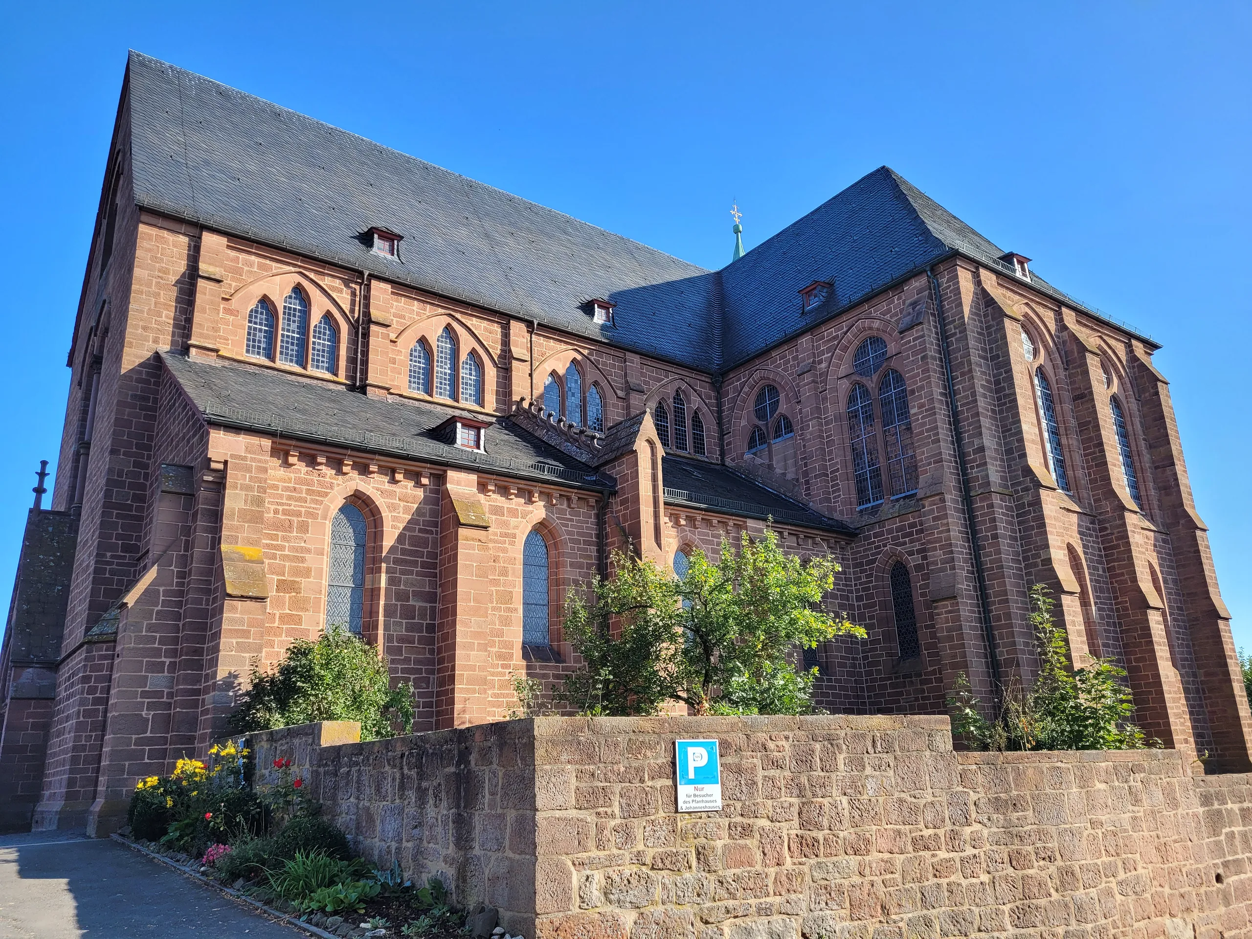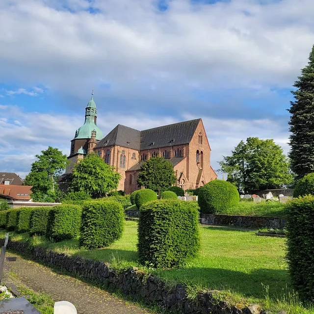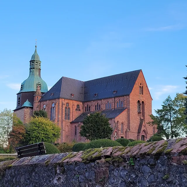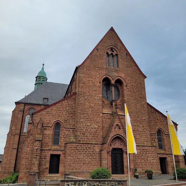 Von 1865 bis 1871 nach Plänen von Georg Gottlob Ungewitter errichtet. Kirchlicher Mittelpunkt des katholischen Umlandes von Amöneburg, Pfarr- und Dekanatskirche. An gleicher Stelle gründete Bonifatius im Jahre 721 sein erstes Missionskloster, das 732 ausgebaut und durch eine Michaelskirche erweitert wurde. Ende des 13. Jhs. folgt der Neubau einer dreischiffigen, gotischen Hallenkirche, die im Jahre 1360 zur Stiftskirche erhoben wurde. Im 30-jährigen Krieg stark zerstört, ab 1660 wieder aufgebaut und von 1711-1713 im Innern barockisiert. Weitere Schäden im 7jährigen Kriege. 1862 bis auf den massiven Turm abgebrochen, danach Neubau.
