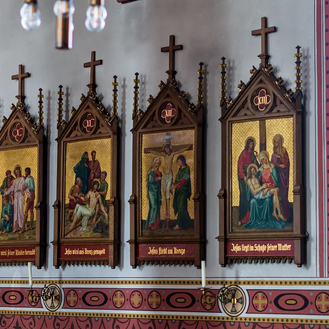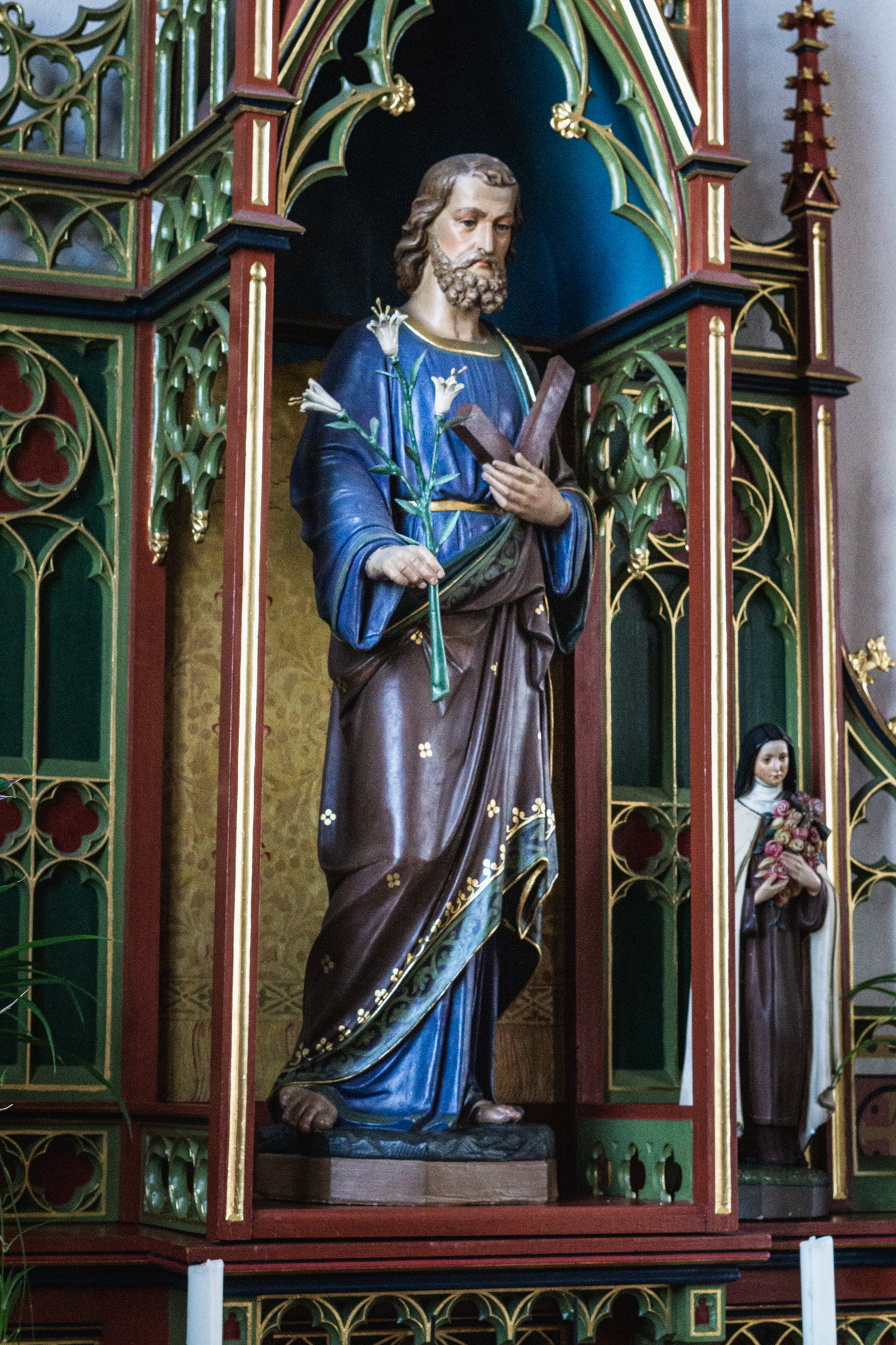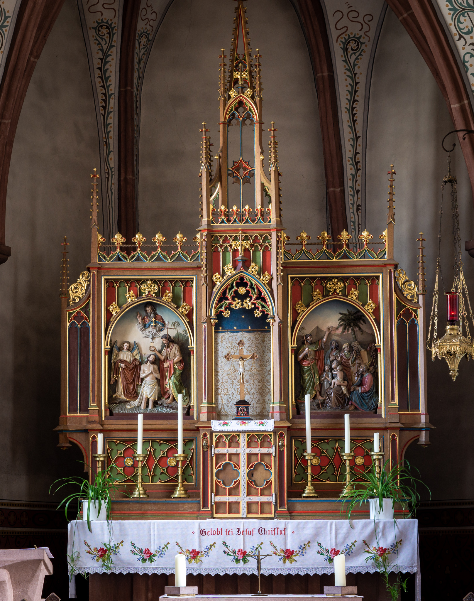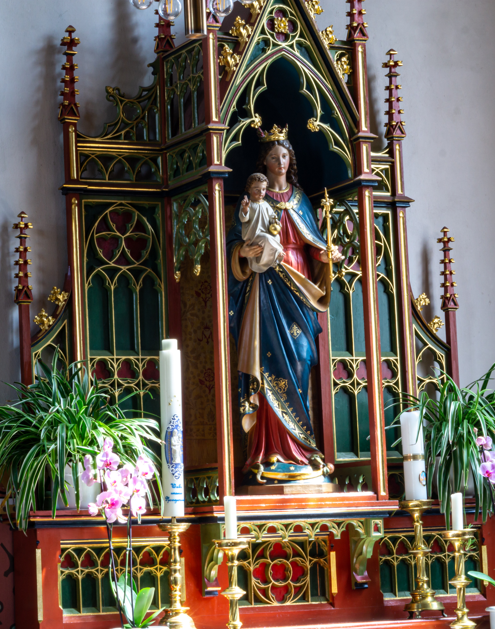 Die komplette neugotische Ausstattung mit Hoch- und Seitenaltären, Kirchengestühl(!), Kreuzwegstationen, Orgel und verschiedene Statuen ist bis heute vollständig erhalten.