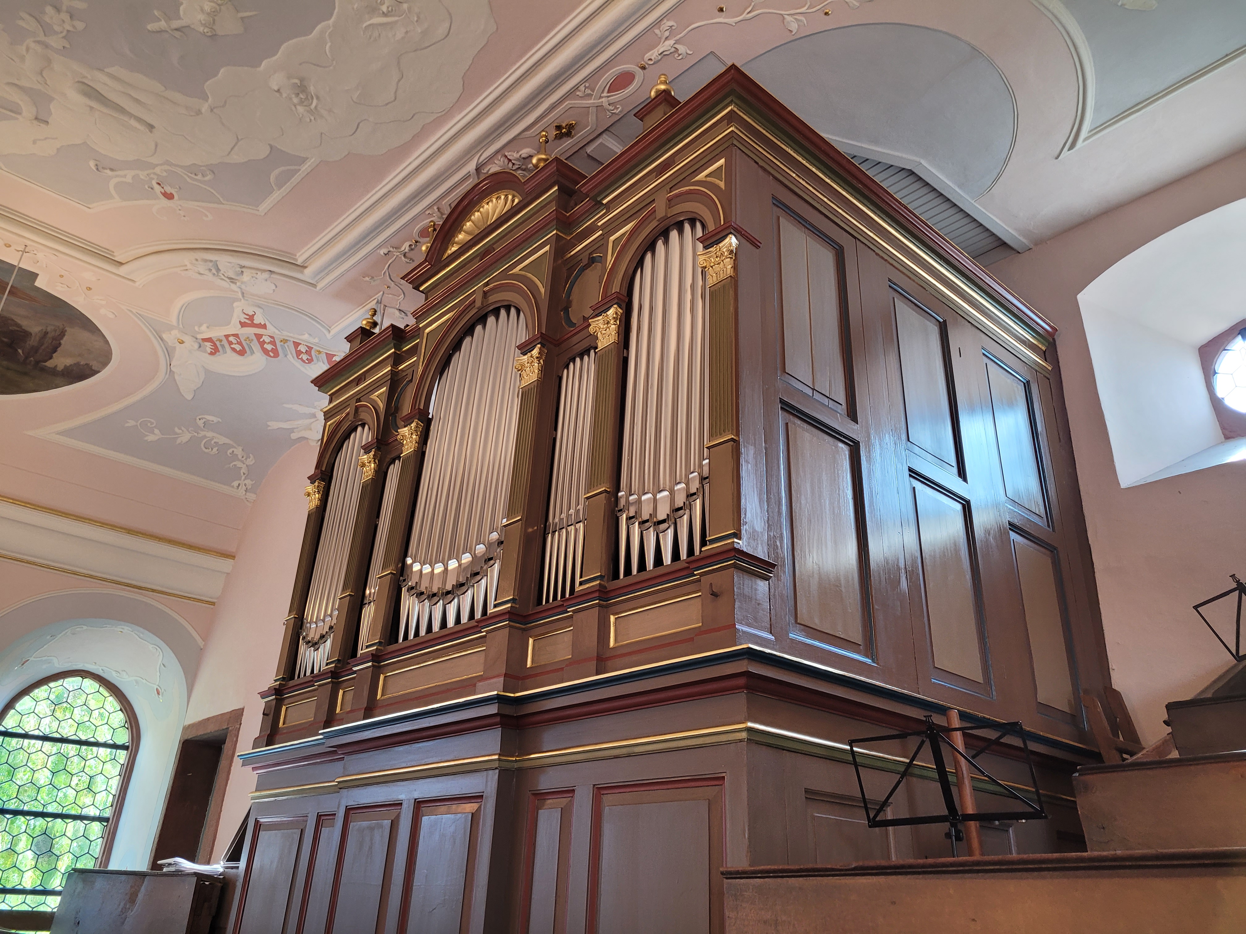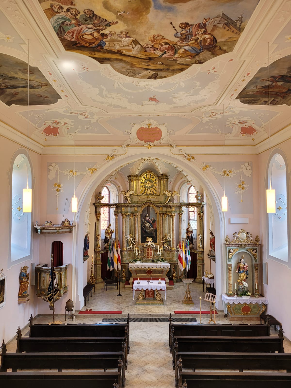 1695 wird die alte Kirche abgebrochen und durch einen spätgotischen Neubau mit Sakristei ersetzt; der massive Wehrturm bleibt erhalten. Ausgeführt werden die Arbeiten durch Tiroler Handwerker, 1696 sind sie abgeschlossen. Über das Aussehen des spätgotischen Kirchenbaus lassen sich recht konkrete Vorstellungen machen, denn weite Teile der heutigen Kirche stammen aus dieser Zeit: u.a. der Chor und zwei Drittel des Kirchenschiffs. Die 22 m lange spätgotische Kirche hat im Chor drei, an jeder Seite des Kirchenschiffes zwei spitzbogige Fenster. Chor und Schiff besitzen ein Holzgewölbe, das im Kirchenschiff auf hölzernen Säulen ruht. Das ursprüngliche Holzgewölbe ist bis heute im Chor vorhanden, aber überstuckt. 1696/97 wird der Innenausbau vorgenommen, 1706 die Kirche feierlich konsekriert.