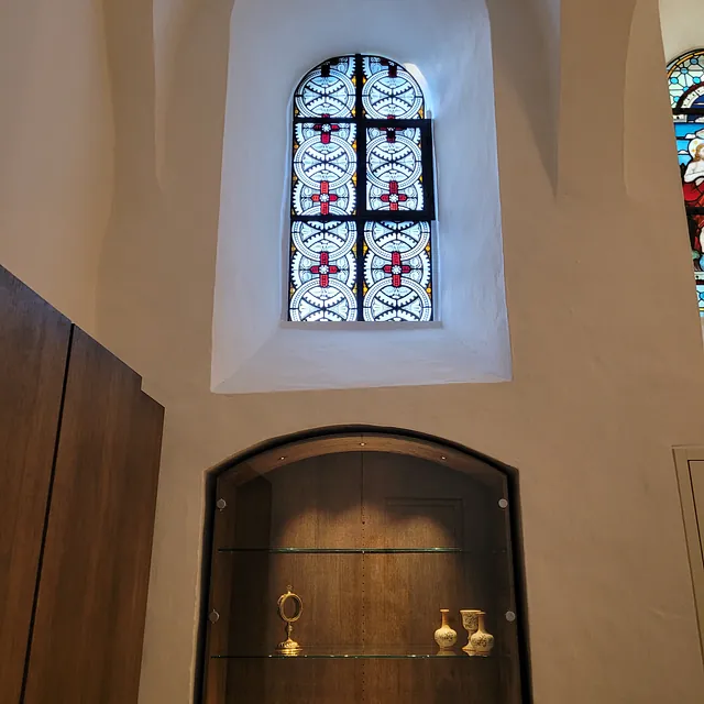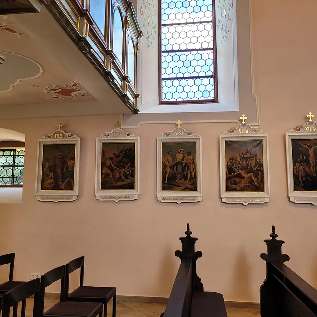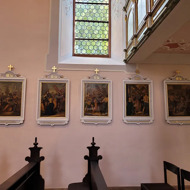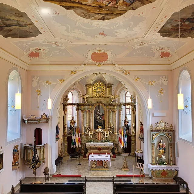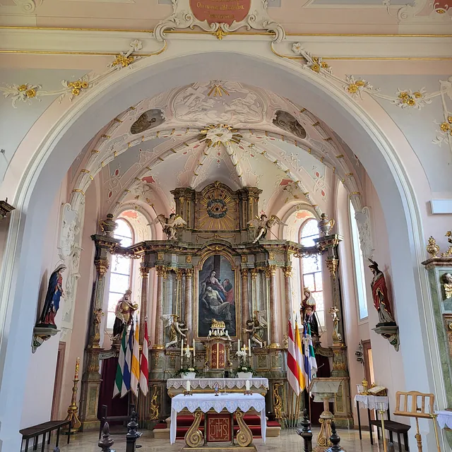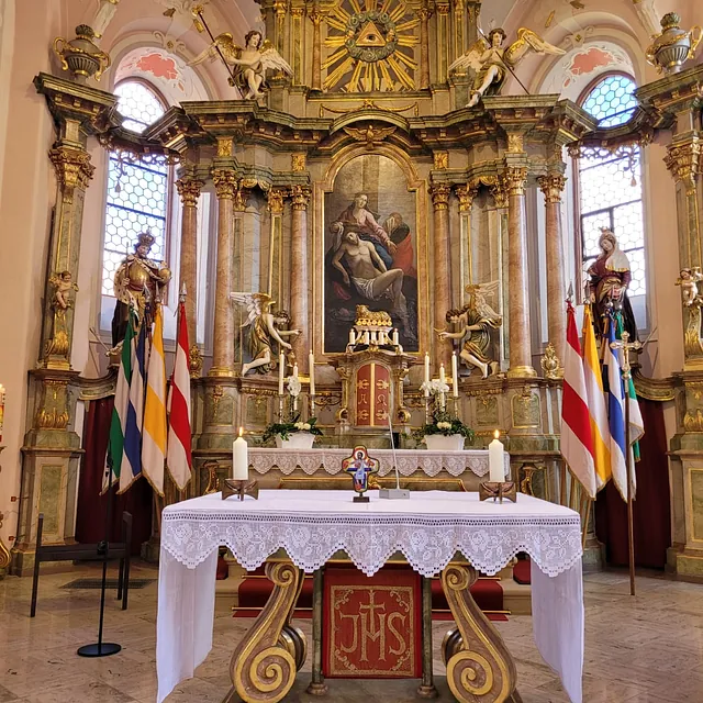 Altarbild: Das Thema des Altarbildes entspricht dem der dreizehnten Kreuzwegstation. Der Gekreuzigte liegt im Schoß Marias, im Hintergrund kniet weinend Johannes, der Lieblingsjünger Jesu. Über dem Geschehen schwebt der Heilige Geist in Taubengestalt.