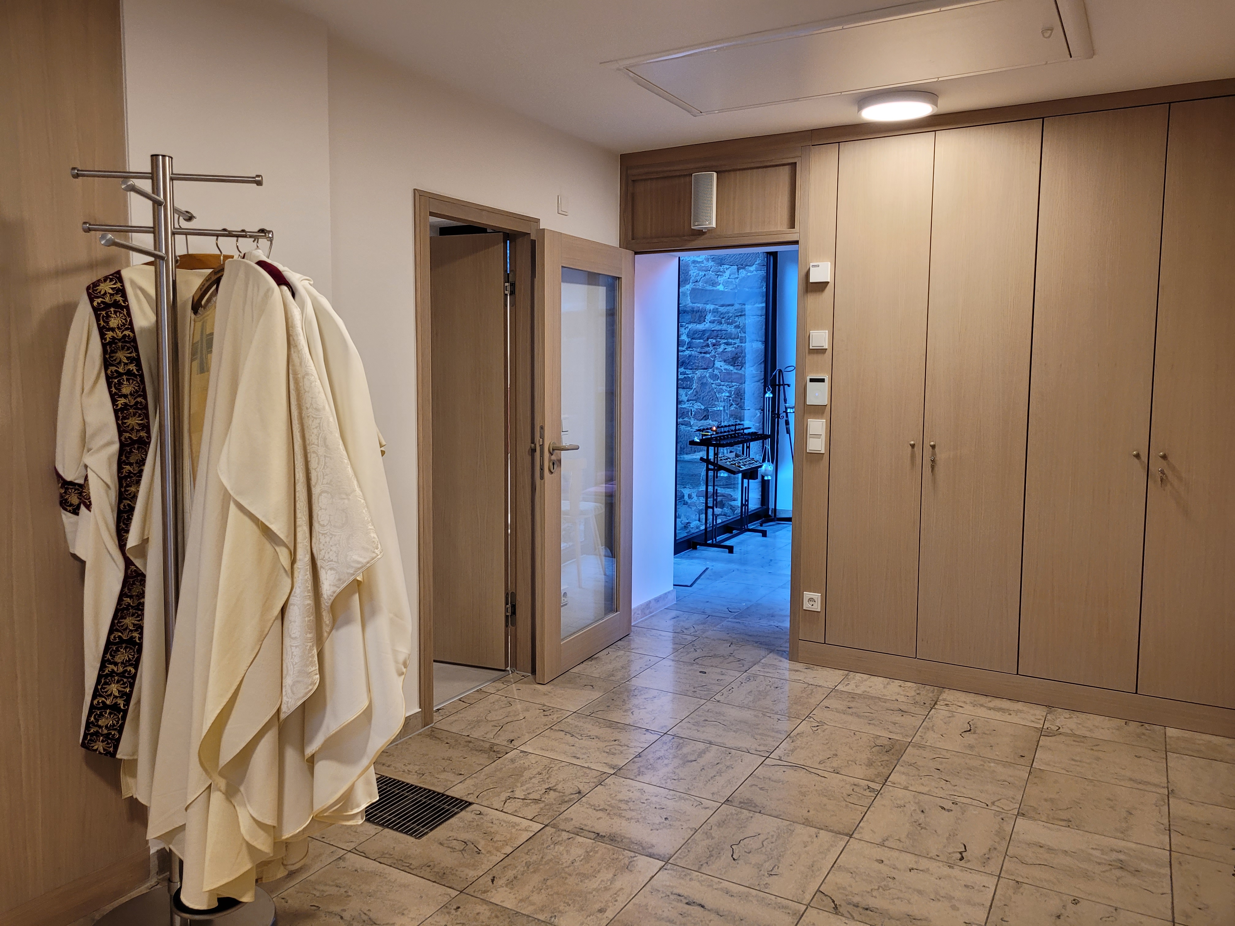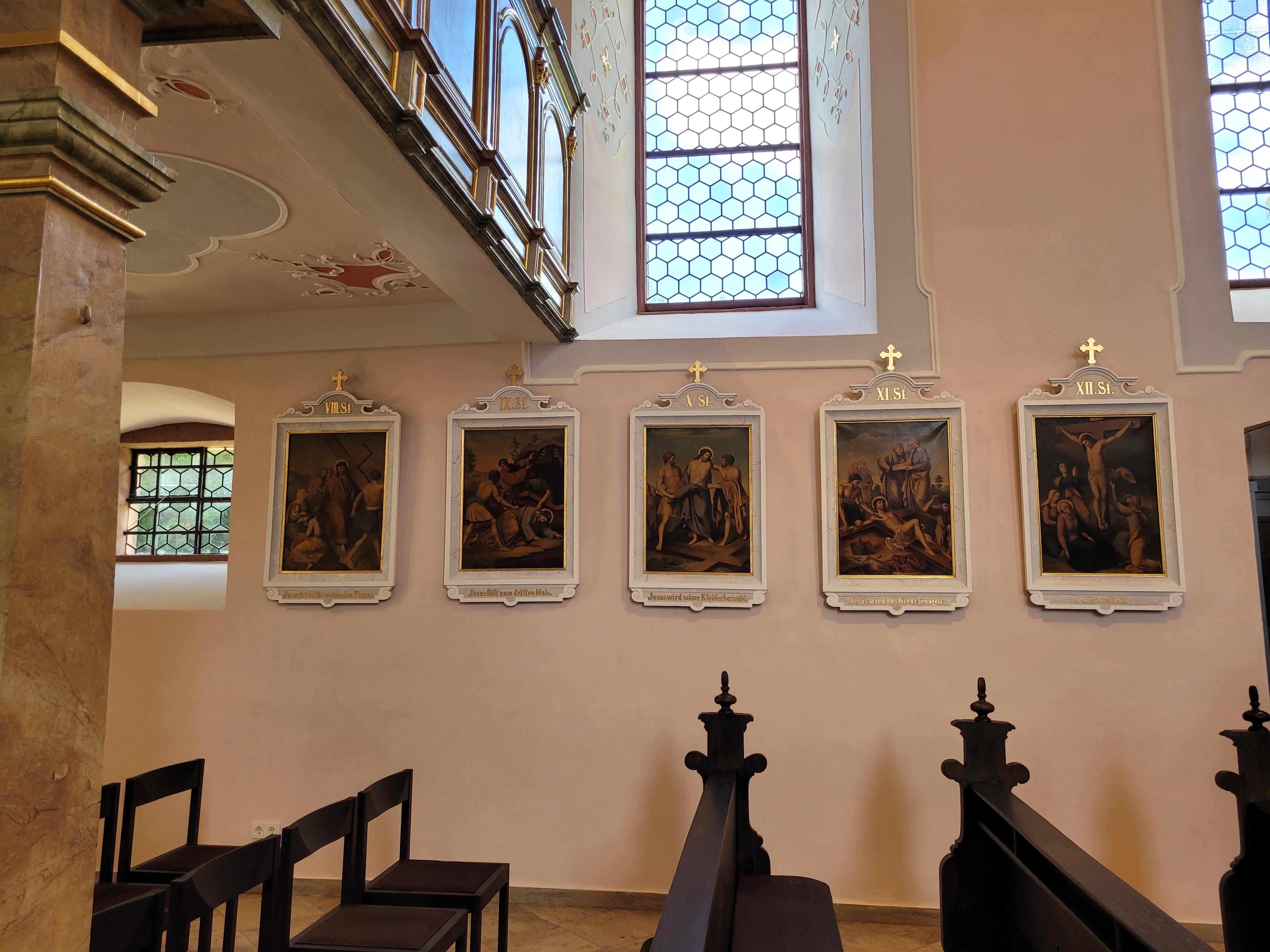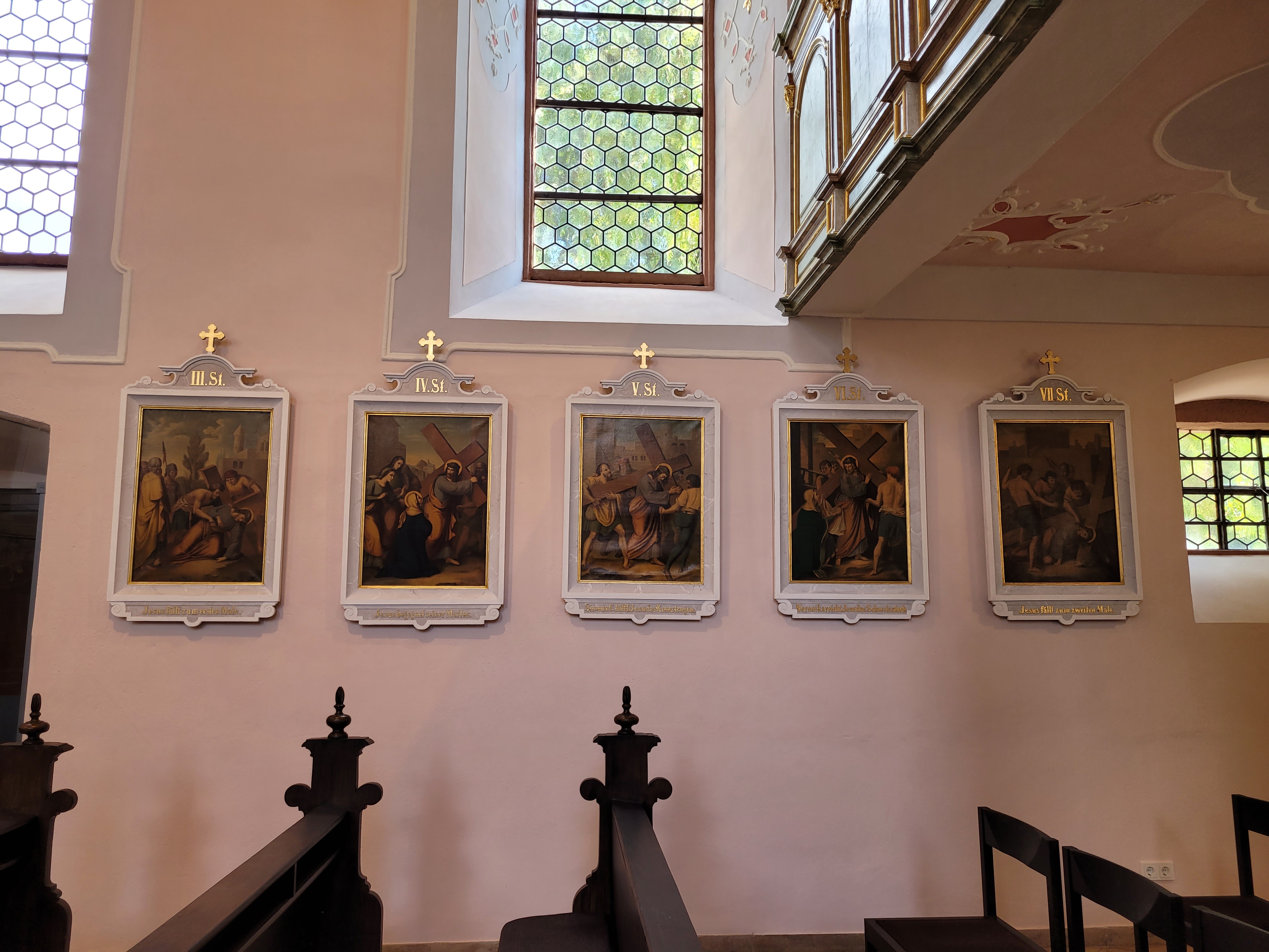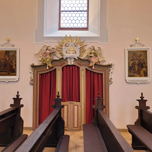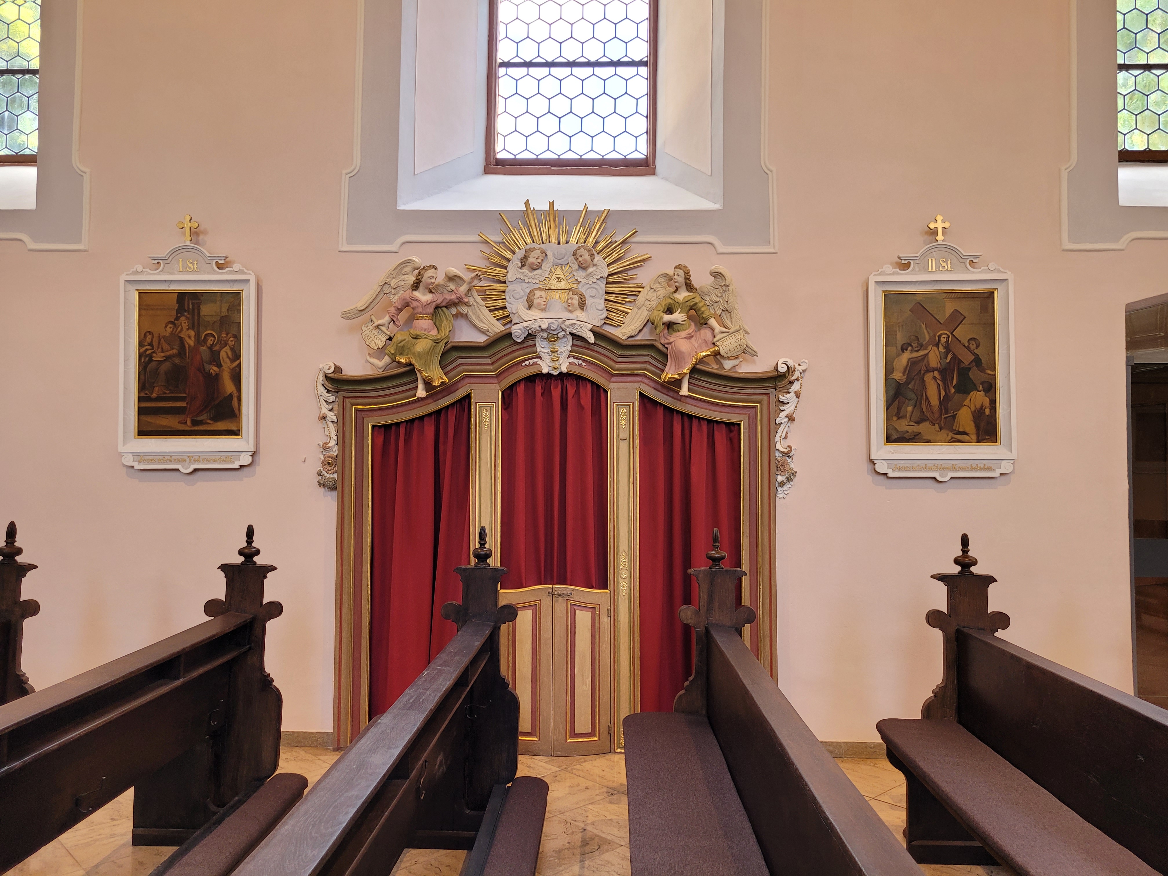 In die Seitenwände der Kirche sind zwei Beichtstühle eingelassen. Heute sind sie nicht mehr in Gebrauch, das Sakrament der Beichte wird in der alten Sakristei gespendet. Über den Beichtstühlen befindet sich (umgeben von Engeln im Strahlenkranz) ein Auge in einem Dreieck, das Zeichen der Allgegenwart des dreieinen Gottes. Links und rechts sitzen Engel mit Schriftrollen in Händen, die lateinische Bibelverse enthalten: