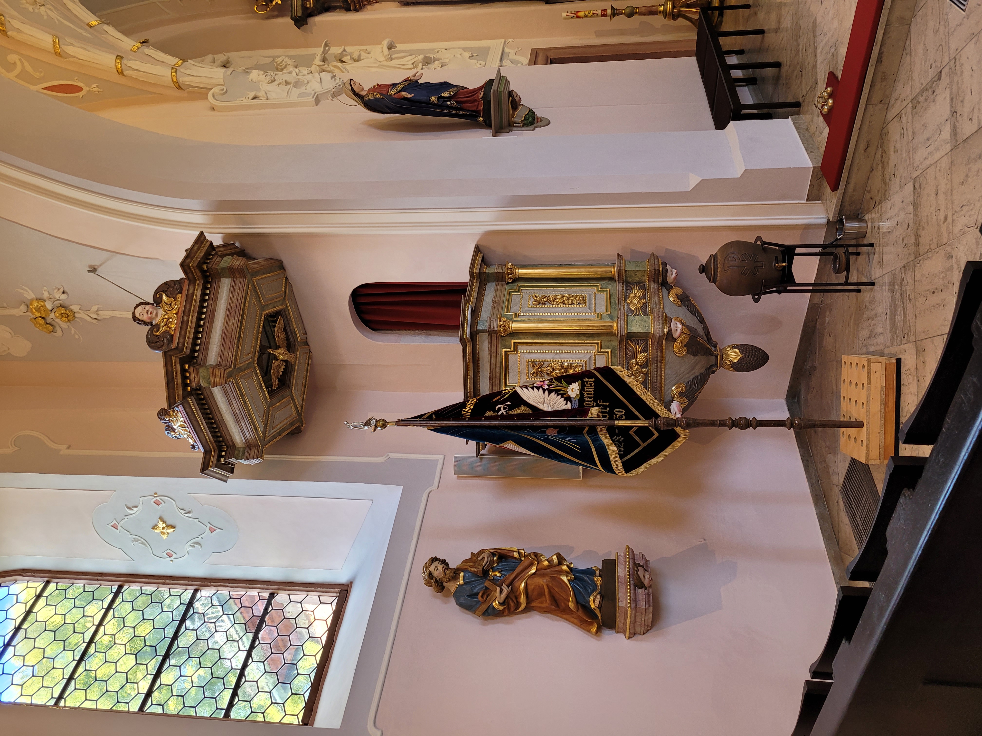Engel mit Weihrauch: Der Engel rechts neben dem Tabernakel umfasst ein „Schiffchen“, das Aufbewahrungsgefäß für den Weihrauch; der linke Engel hält ein Rauchfass in seinen Händen, das Gefäß zum Verbrennen der Weihrauchkörner. Der Weihrauch symbolisiert die Gebete der Gläubigen, die zu Gott aufsteigen. Gleichzeitig ist er ein Zeichen tiefer Verehrung.
