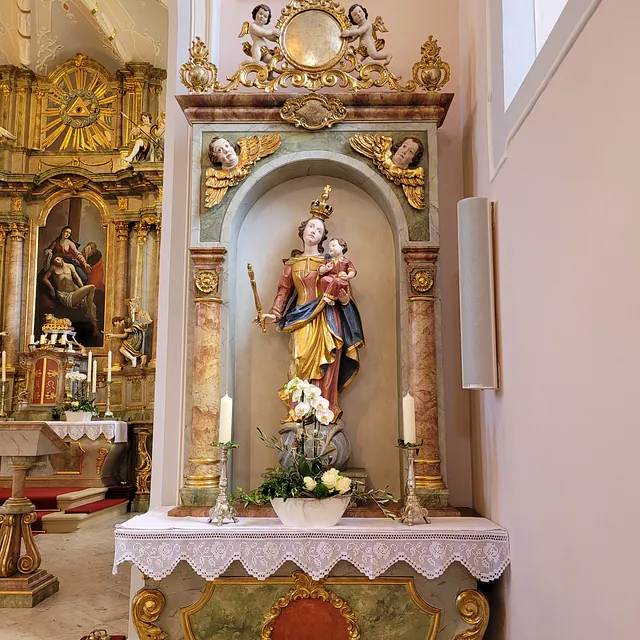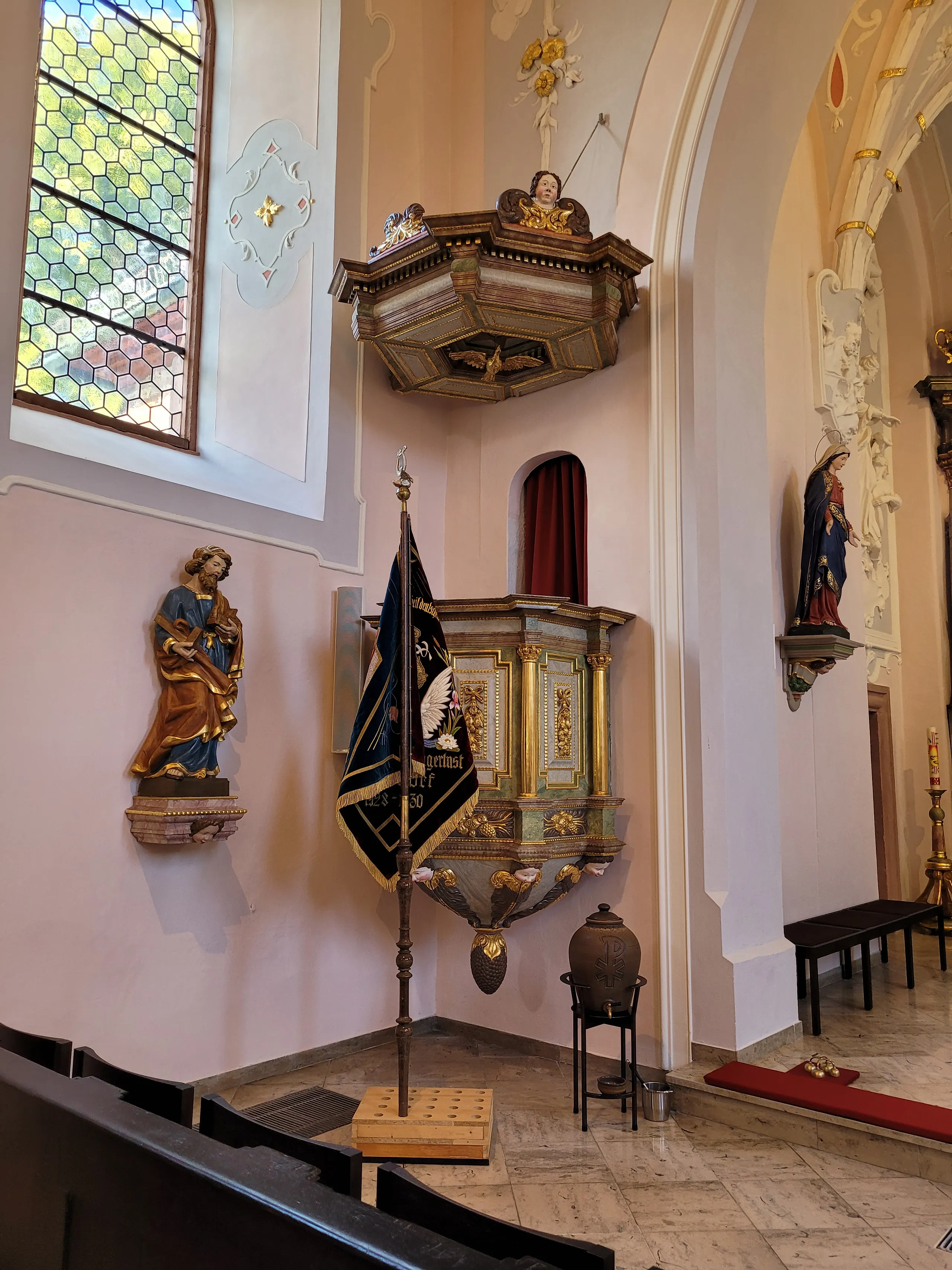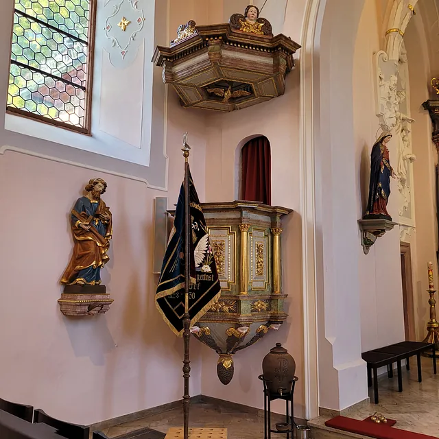 Links neben dem Altarraum befindet sich die barocke Roßdorfer Kanzel, unter deren Dach der Heilige Geist in Form einer Taube schwebt. Bei der Kanzel steht eine Statue des Hl. Josef (1998). Der Taufstein stammt aus dem Jahr 1786. Rechts neben dem Altarraum befindet sich der Marienaltar (1954/55 aufgestellt). Maria, die als Königin dargestellt ist, steht auf der Weltkugel. Mit ihrem Fuß zertritt sie die höllische Schlange, ein Motiv aus der Paradiesgeschichte.