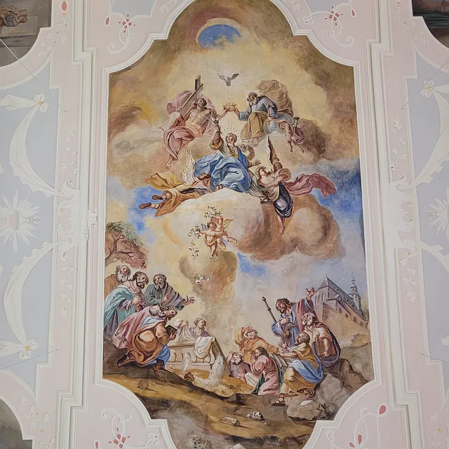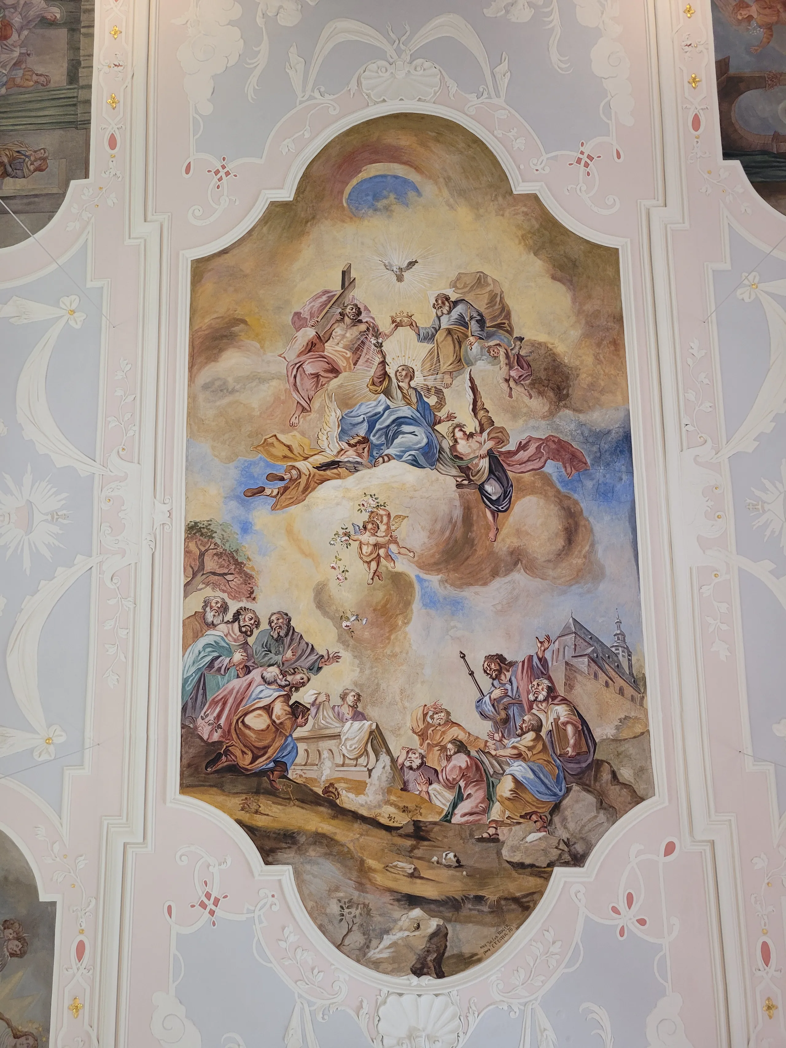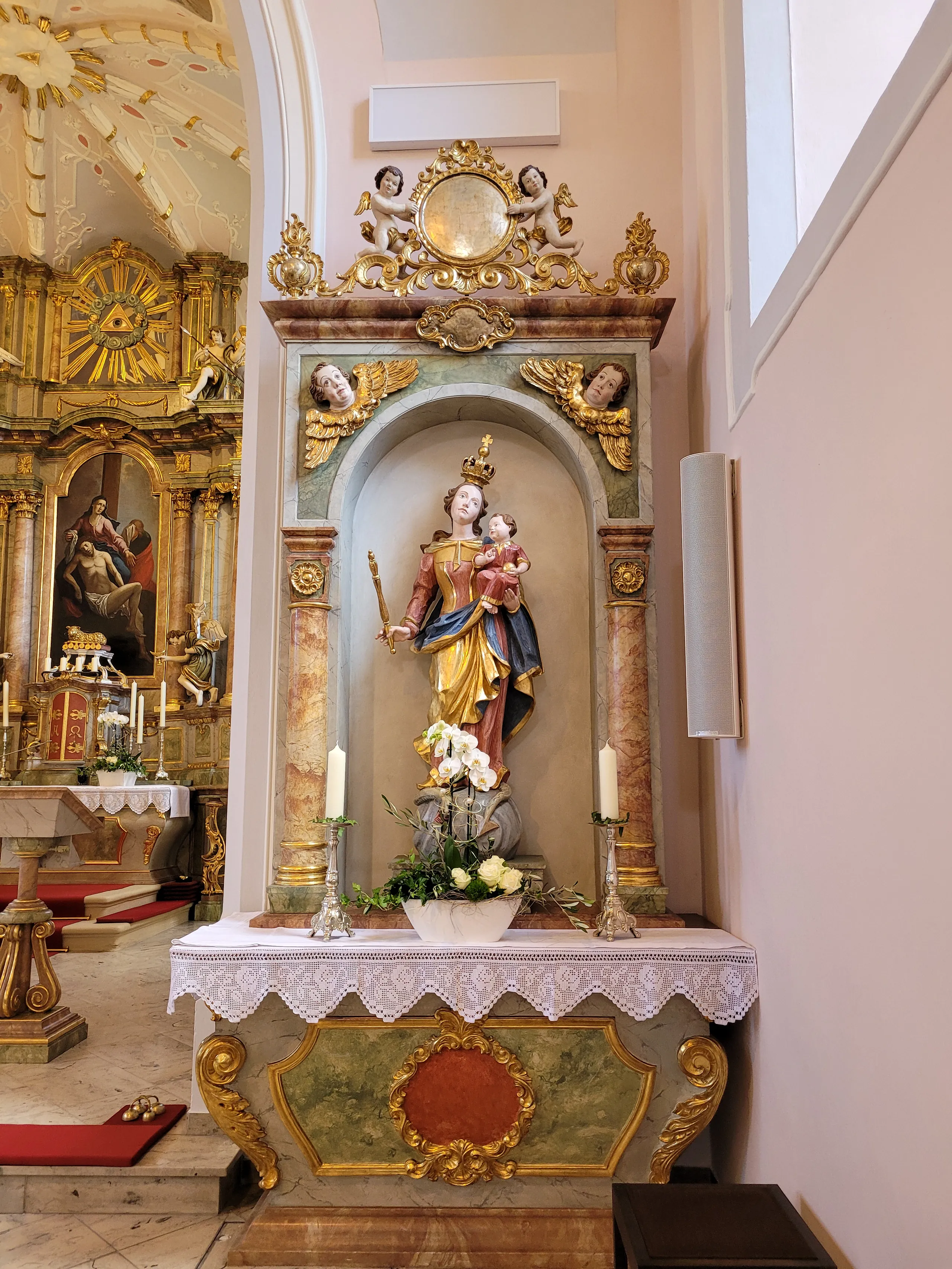 Übersetzung: Heilige Maria, Mutter Gottes, Jungfrau und Urmutter des gan-zen Erdkreises, bitte für uns jetzt und am Ende unseres Lebens. Fasst man die Großbuchstaben als römische Zahlzeichen auf, so erhält man das Jahr, in dem Giovanni Batista Vico die Stuckarbeiten in der Kirche beendete: 1x1000 (M) + 1x500 (D) + 2x100 (C) + 1x10 (X) + 3x5 (V) + 12x1 (I) = 1737