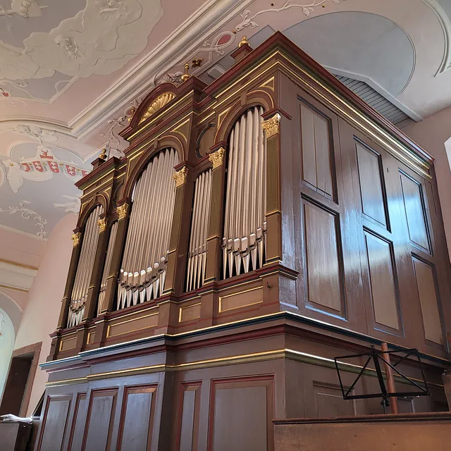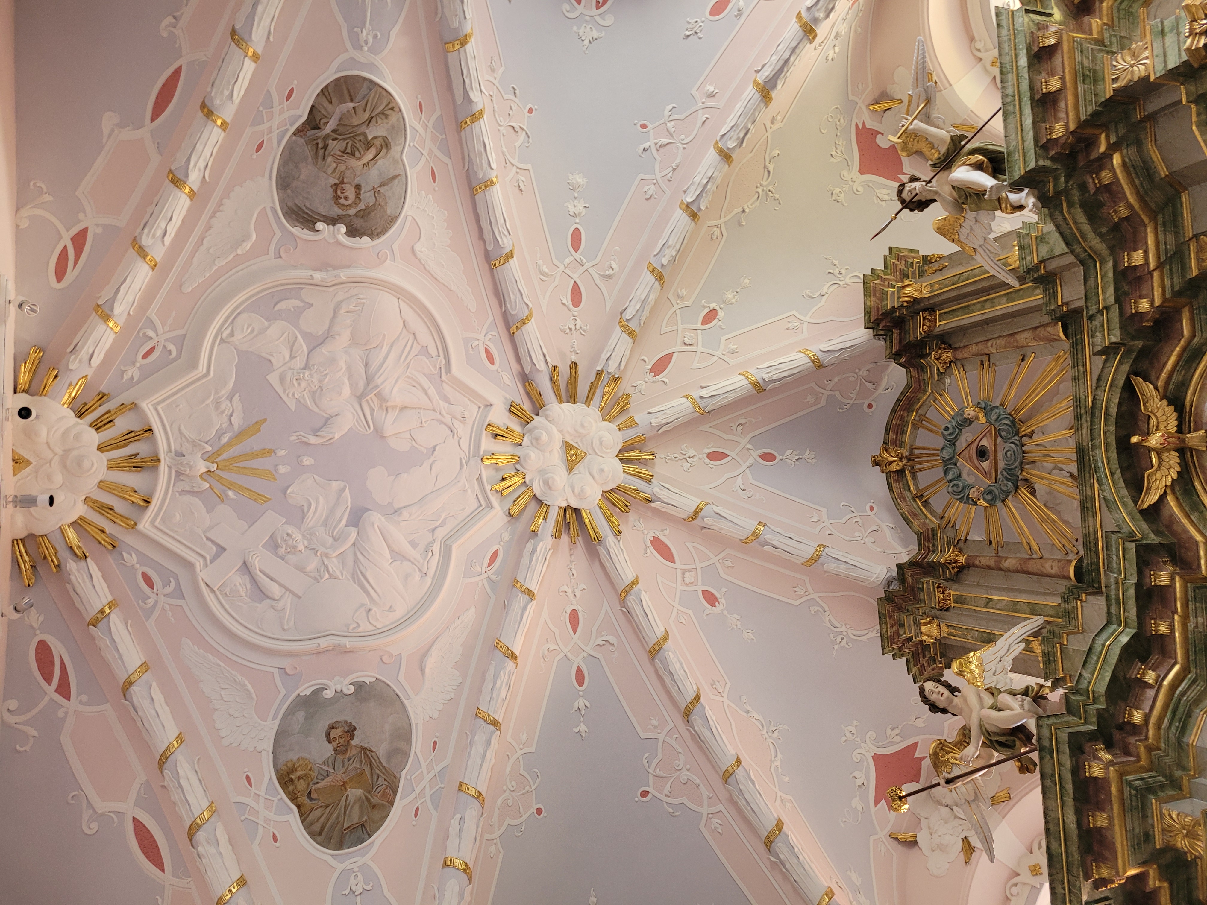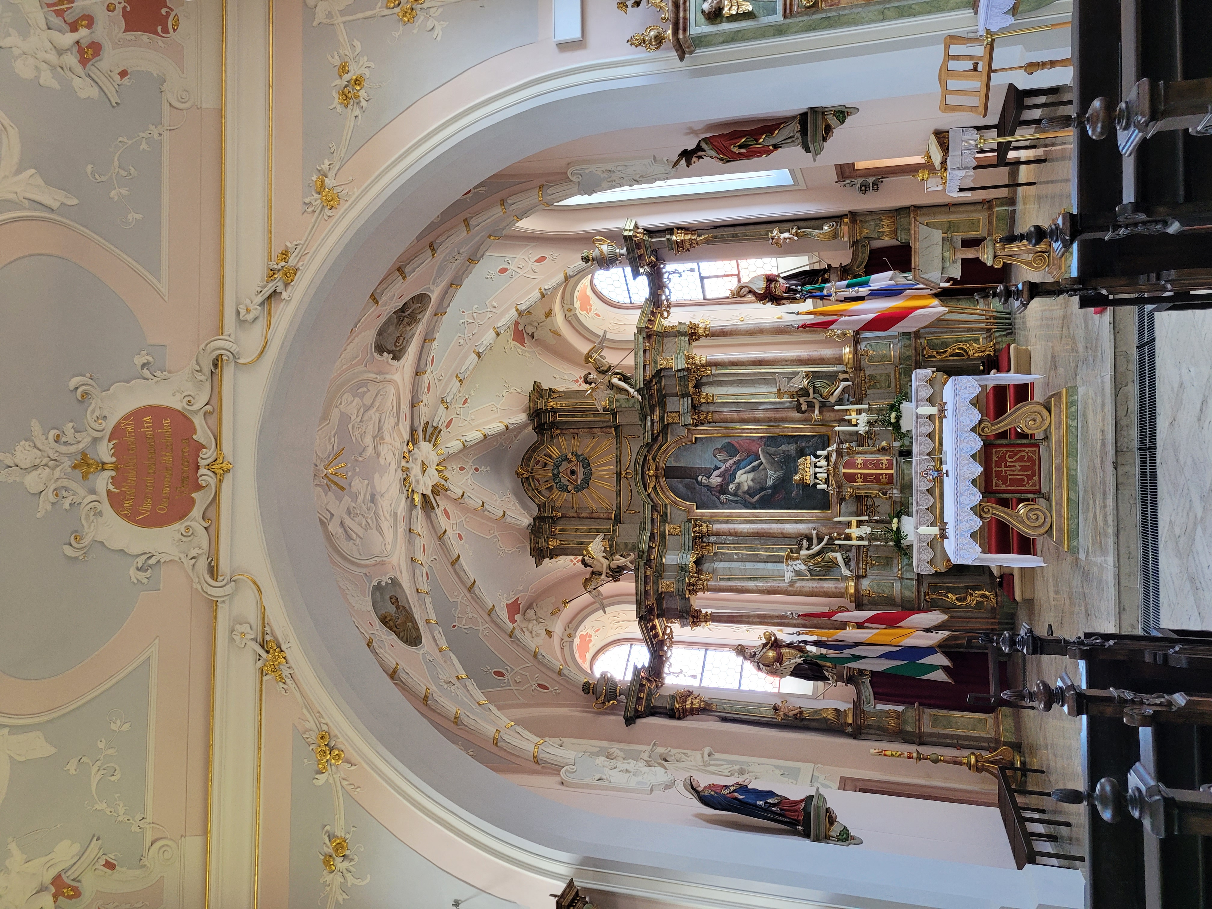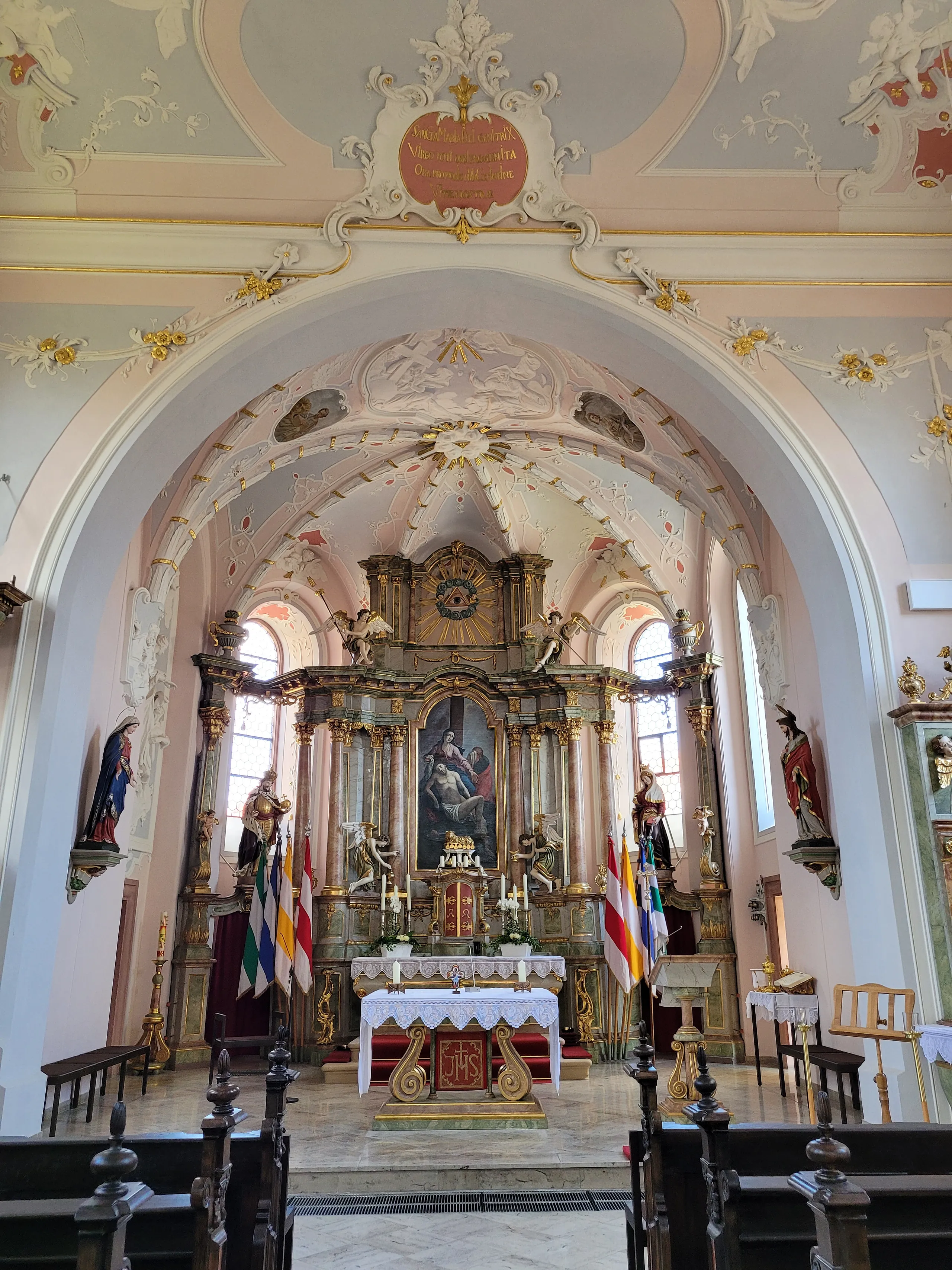 Übersetzung: Heilige Maria, Mutter Gottes, Jungfrau und Urmutter des gan-zen Erdkreises, bitte für uns jetzt und am Ende unseres Lebens. Fasst man die Großbuchstaben als römische Zahlzeichen auf, so erhält man das Jahr, in dem Giovanni Batista Vico die Stuckarbeiten in der Kirche beendete: 1x1000 (M) + 1x500 (D) + 2x100 (C) + 1x10 (X) + 3x5 (V) + 12x1 (I) = 1737