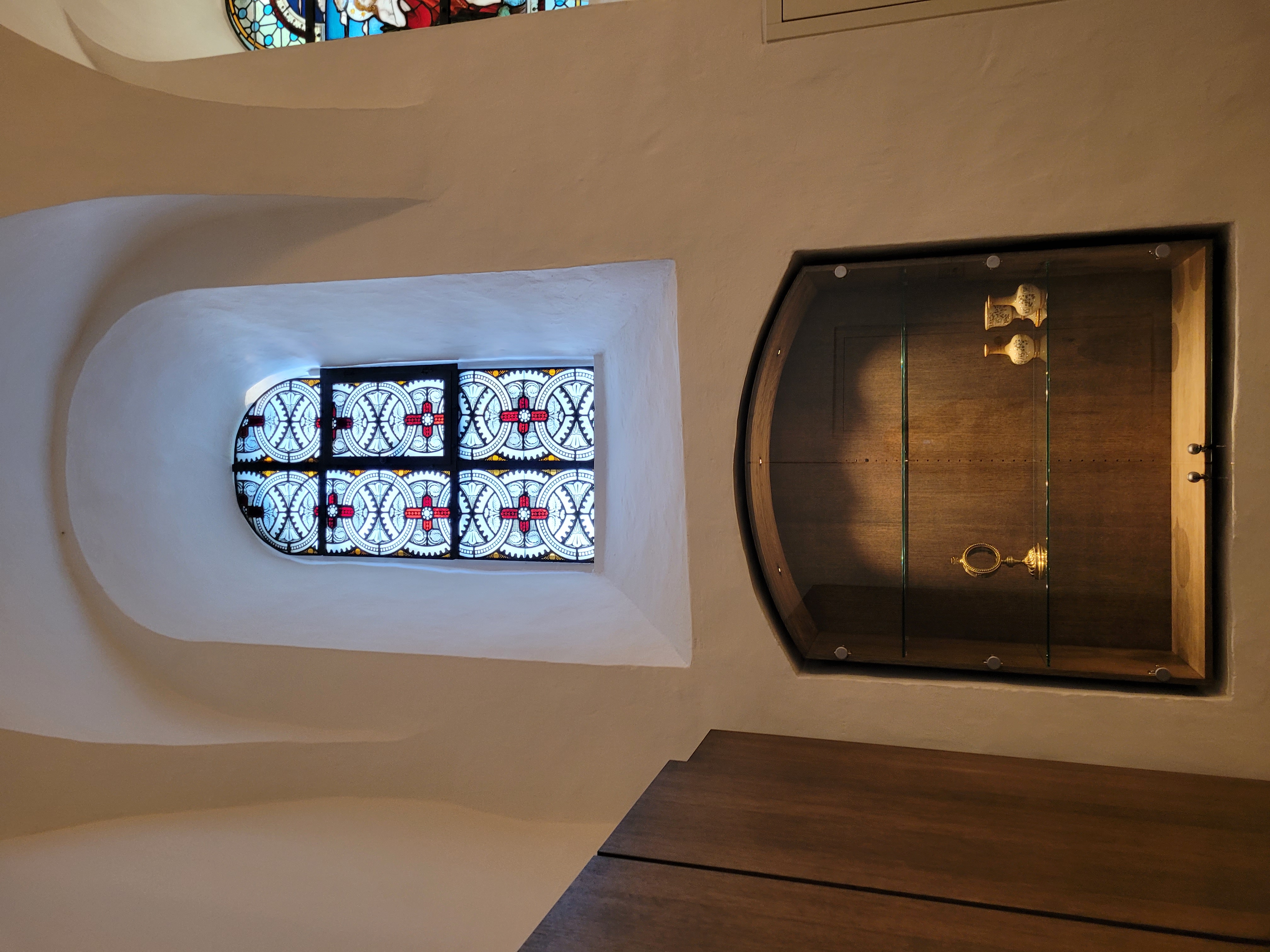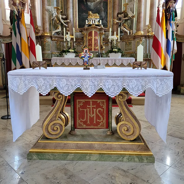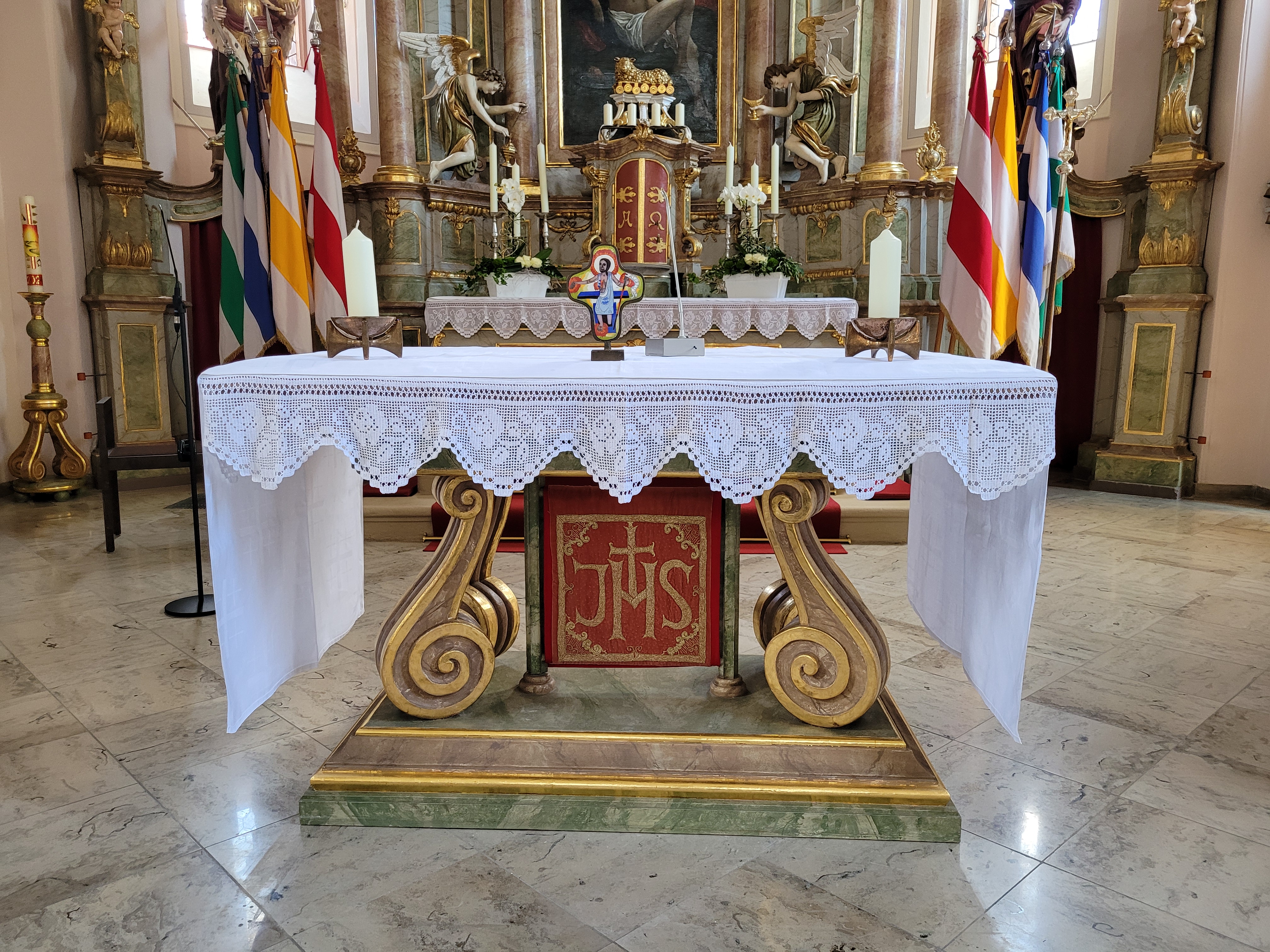Der Tabernakel: Tabernakel bedeutet übersetzt Zelt. Er ist Aufbewahrungsort der gewandelten Hostien und somit Wohnstatt Gottes, dessen Gegenwart das ewige Licht anzeigt. Die Buchstaben A und W bedeuten, dass Christus Anfang und Ende, „Α und Ω der Welt“ ist. Das A ist der erste, das Ω der letzte griechische Buchstabe.