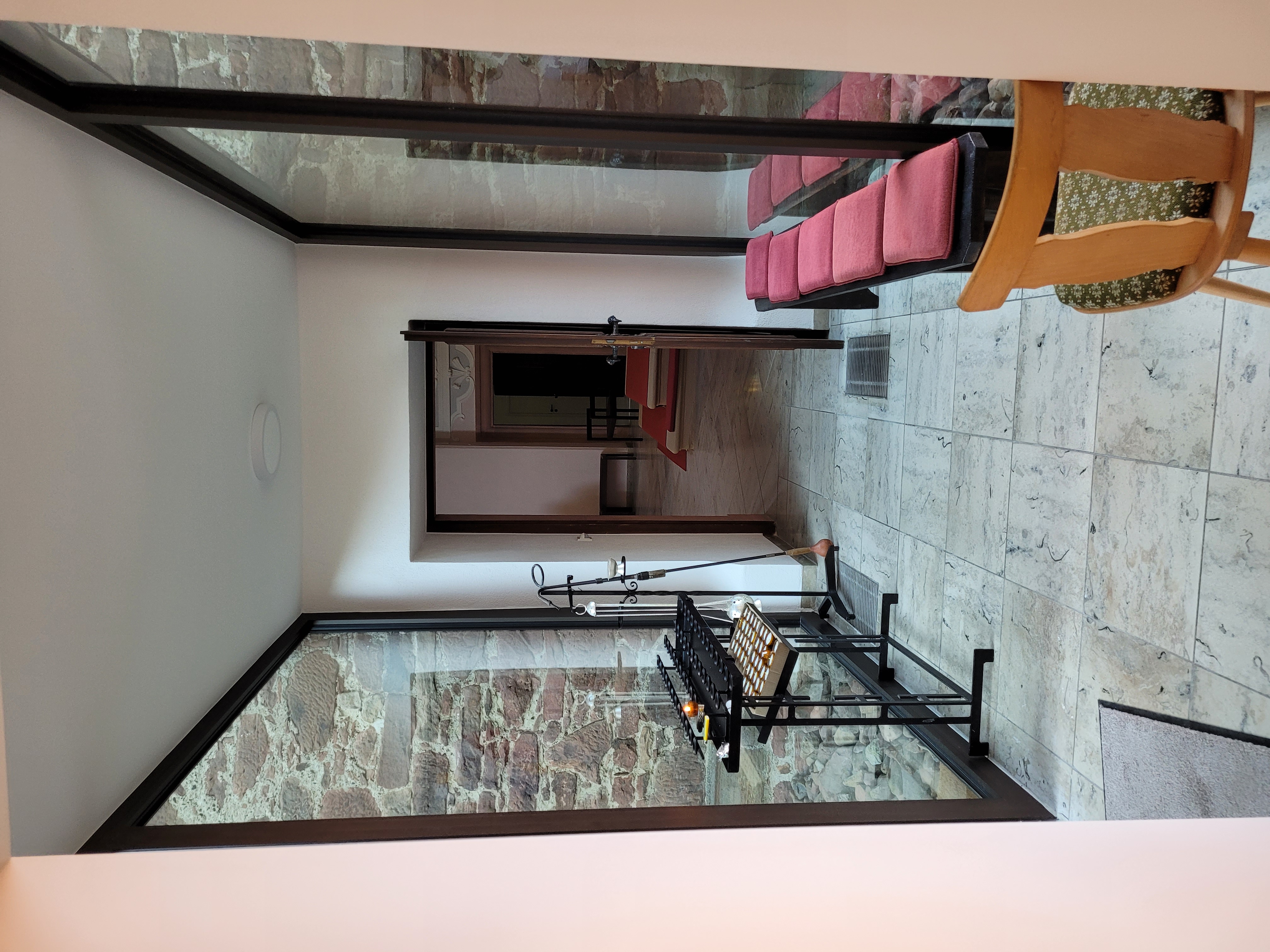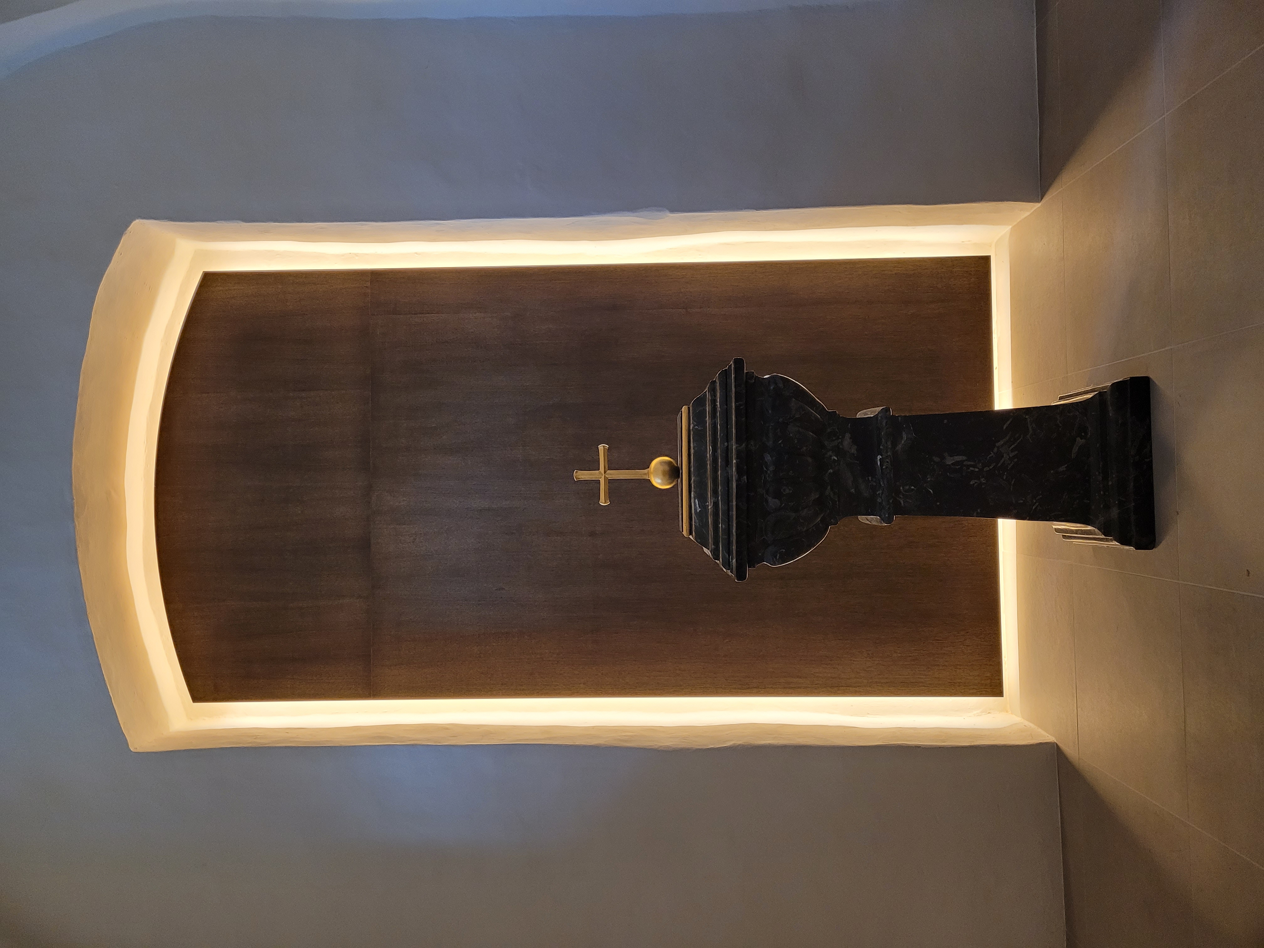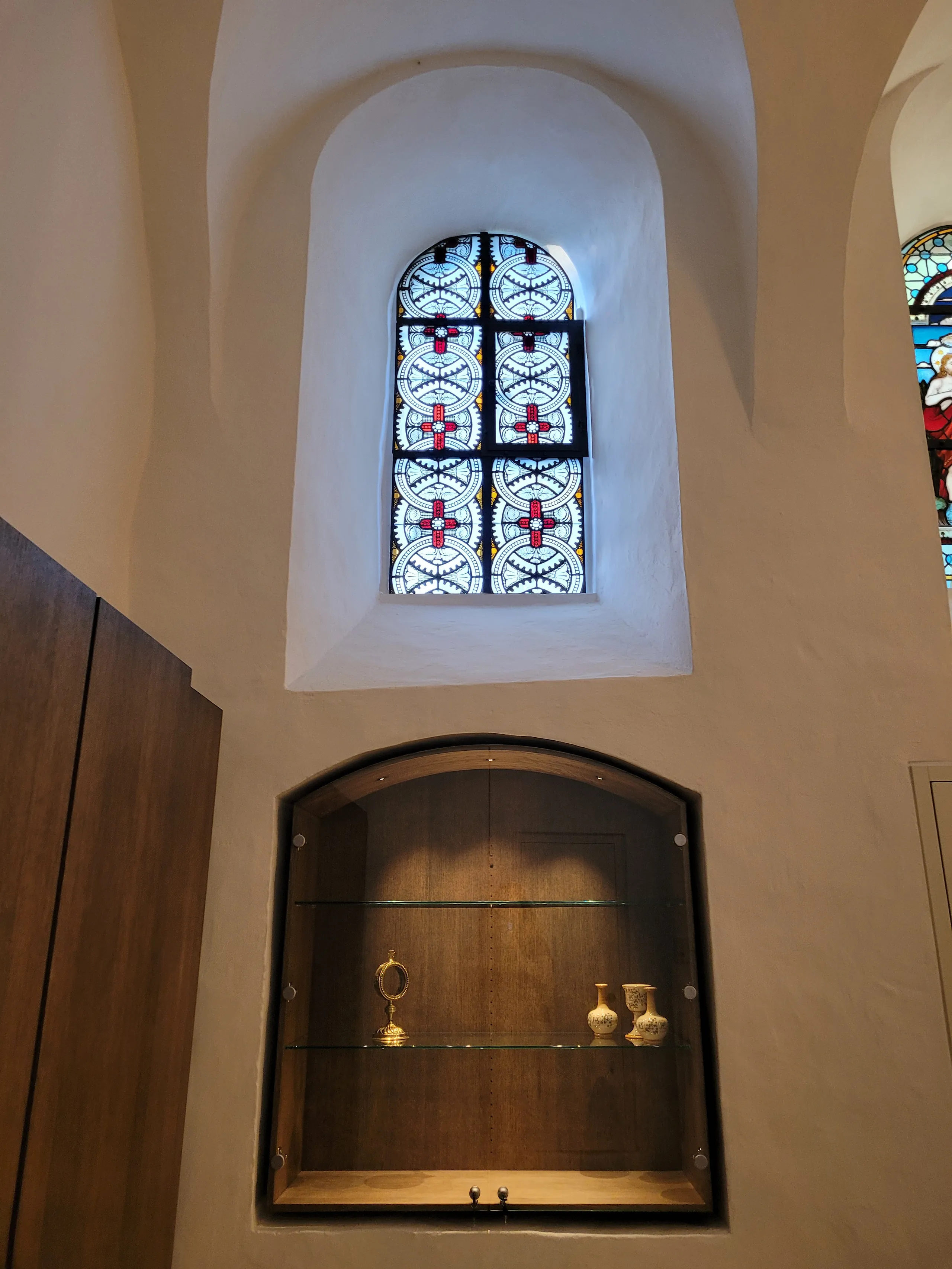 Der Tabernakel: Tabernakel bedeutet übersetzt Zelt. Er ist Aufbewahrungsort der gewandelten Hostien und somit Wohnstatt Gottes, dessen Gegenwart das ewige Licht anzeigt. Die Buchstaben A und W bedeuten, dass Christus Anfang und Ende, „Α und Ω der Welt“ ist. Das A ist der erste, das Ω der letzte griechische Buchstabe.