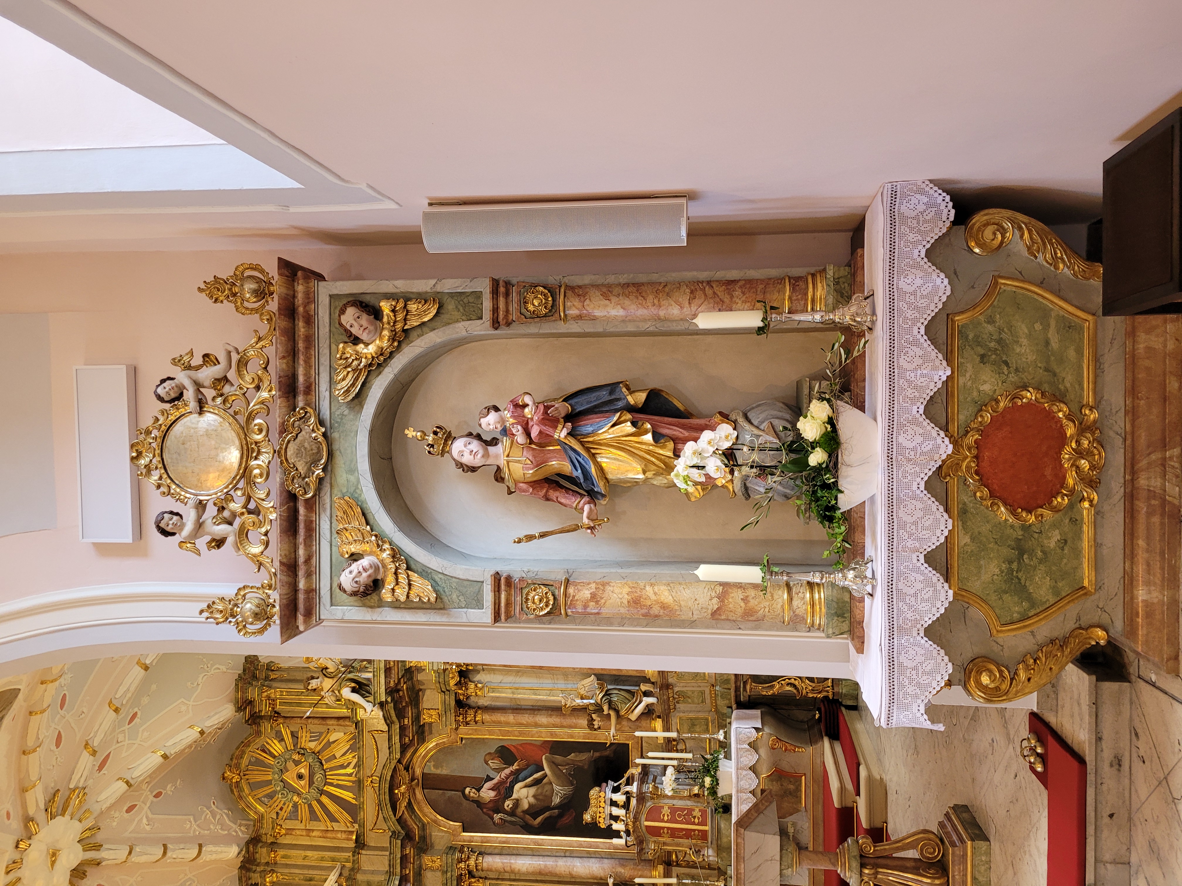 Rechte Altarfigur: Hl. Kunigunde (980-1033). Obwohl Kaiser Heinrich seine Frau Kunigunde sehr liebte, hatte er Zweifel an ihrer Treue und forderte ein Gottesurteil: Sie sollte barfuß über glühende Pflugscharen laufen. Diese tat es auf Gott vertrauend, der ihre Unschuld kannte, und beschämte damit ihren Mann. Unter Umständen handelt es sich bei der Figur um Elisabeth von Thüringen.