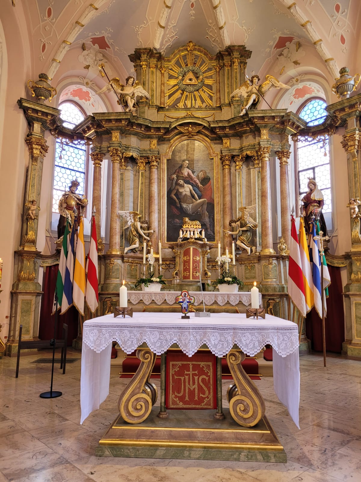 Passionsengel: Die beiden Engel, die links und rechts über dem Altarbild sitzen, halten die Kreuzigungswerkzeuge Jesu in Händen: Hammer, Zange, Nägel, Essigschwamm und die Lanze, mit der Jesu Seite durchbohrt wurde.