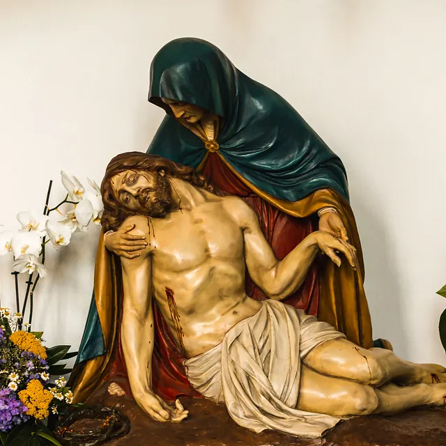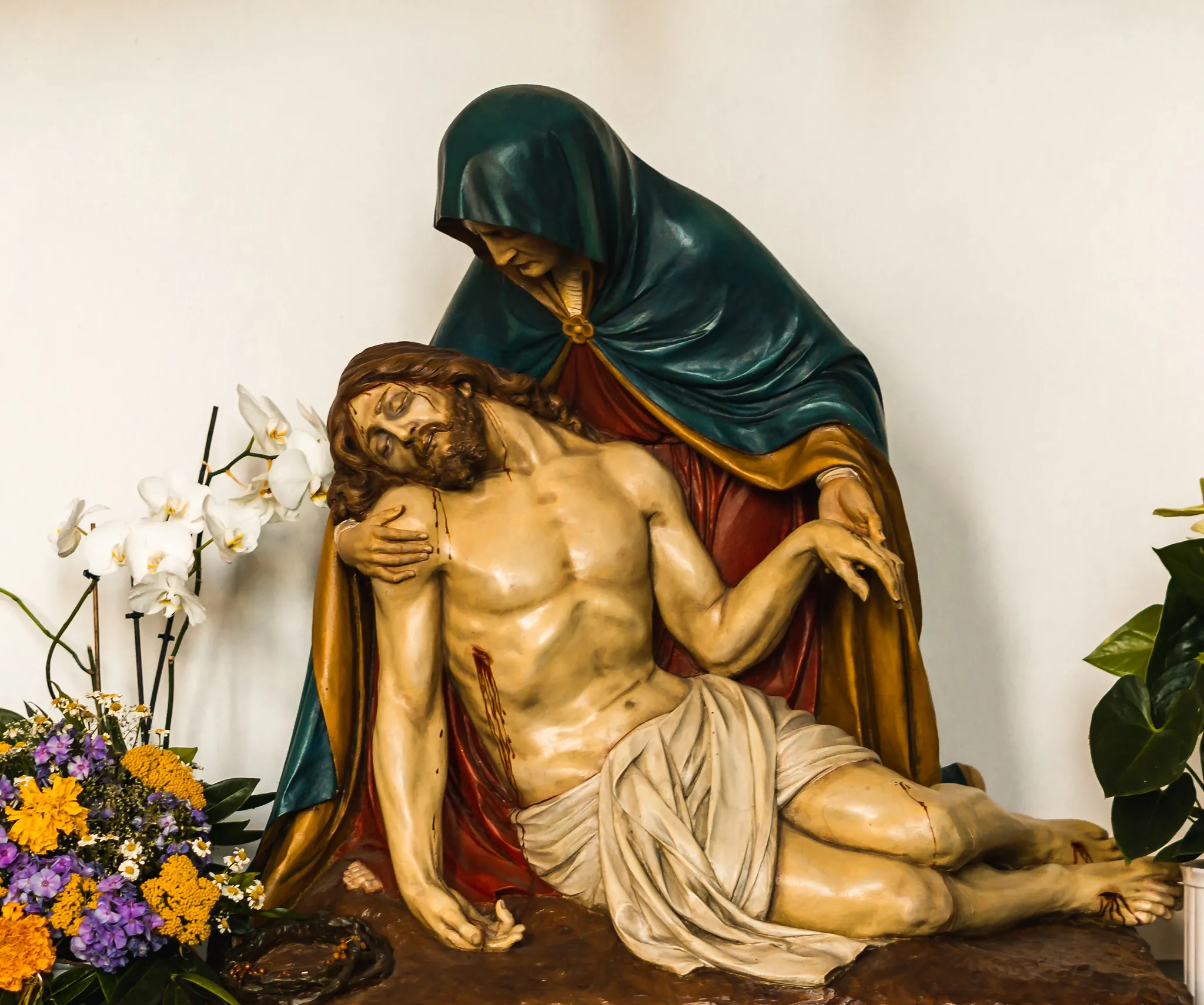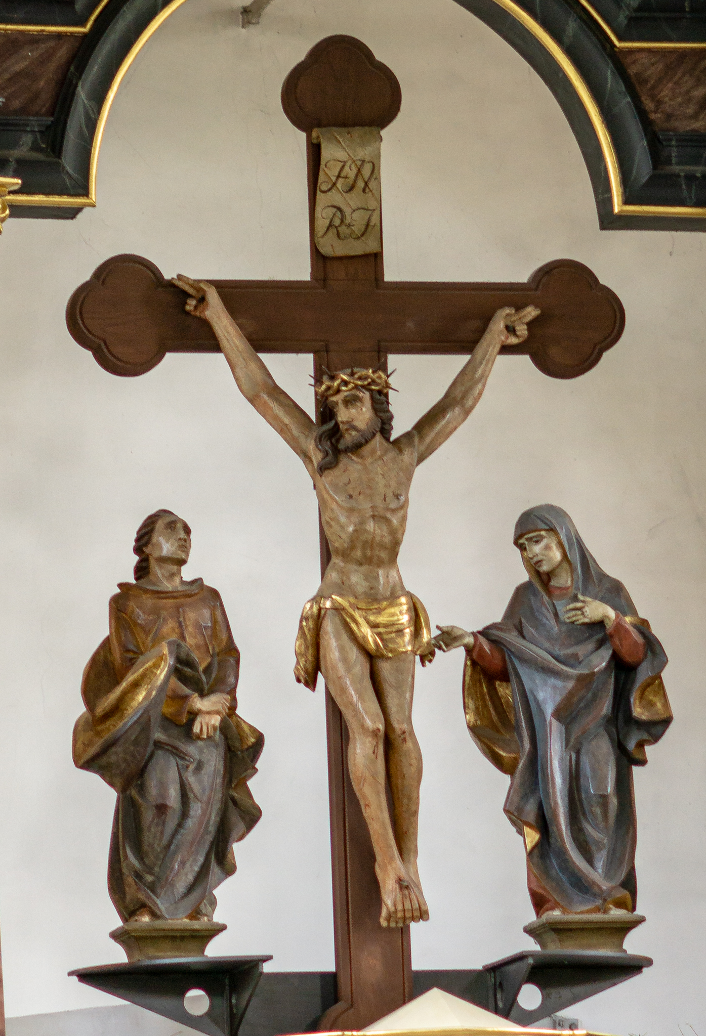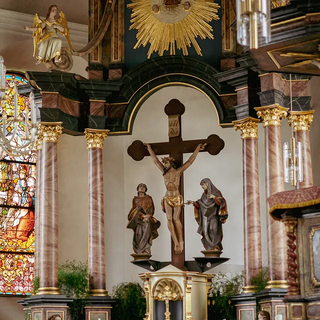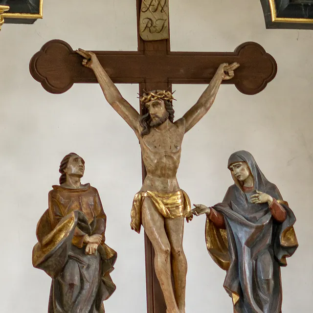 Das Kreuz ist Zeichen für Hoffnung und Leben. Die Kreuzbalken im Hochaltar münden in Kleeblätter - das Marterwerkzeug wird so zu einem Baum. Und Christus am Kreuz ist hier nicht als Sterbender dargestellt, sondern als lebender Hoffnungsträger.