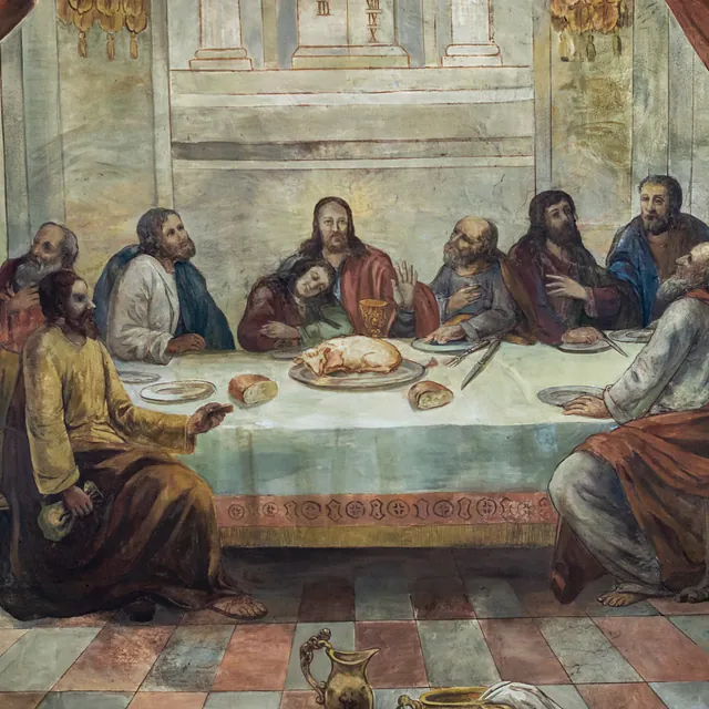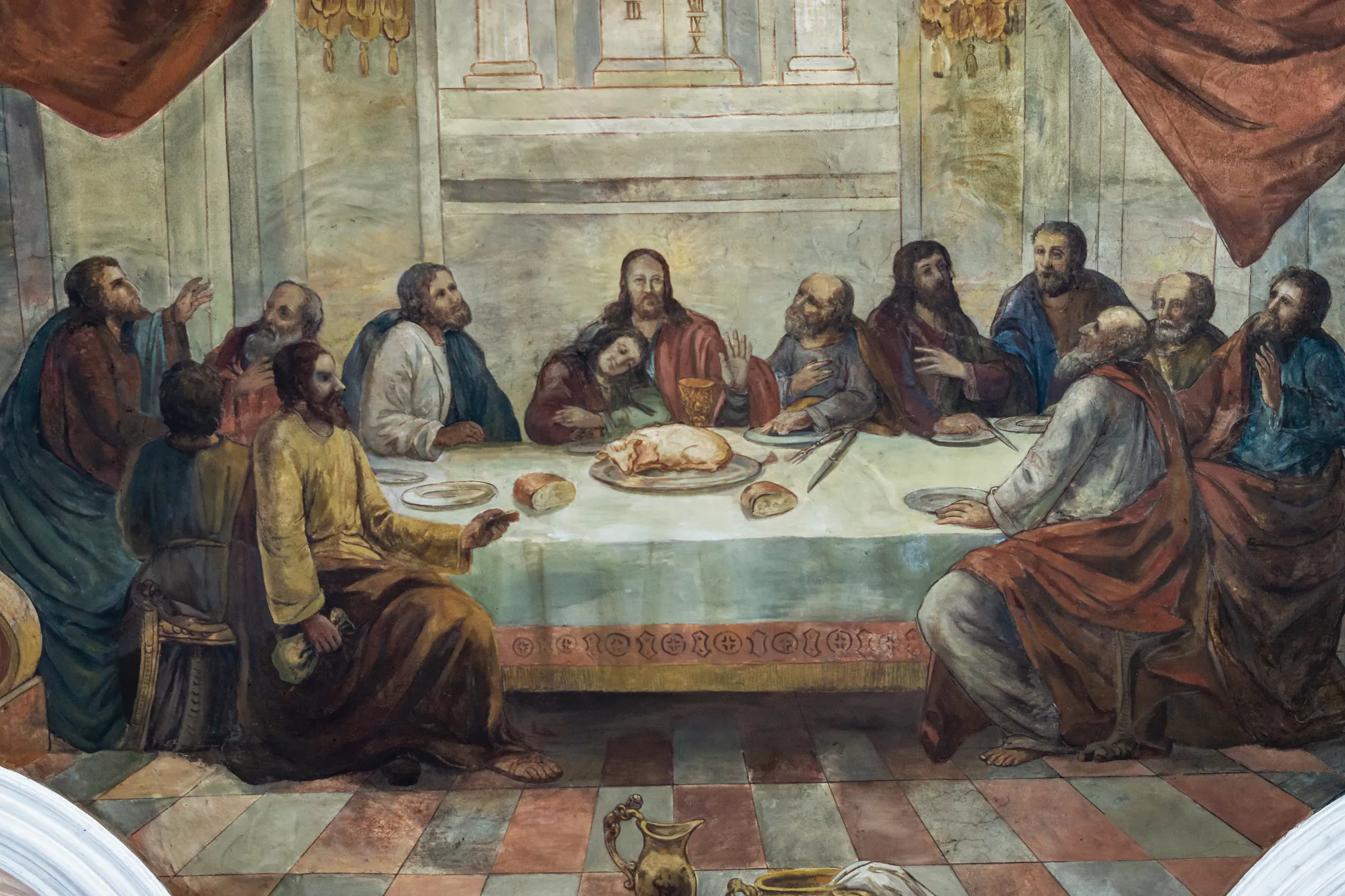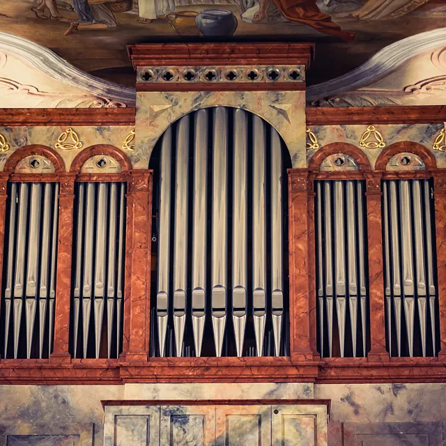 Ein durchdachtes theologisches Programm zum Thema "Kreuz" bestimmt drei große Deckengemälde und zehn kleinere Fresken in der Deckenschräge. Kunsthistorisch interessierte begeistern aber vor allem die aus Gips gefertigten Umrahmungen und Verzierungen dieser Bilder: imaginäre Füllhörner, Pfauenfedern, Weihrauchfässer und Blumensträuße sind da zu entdecken.