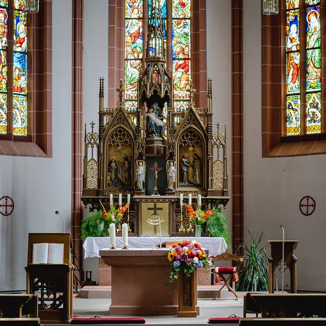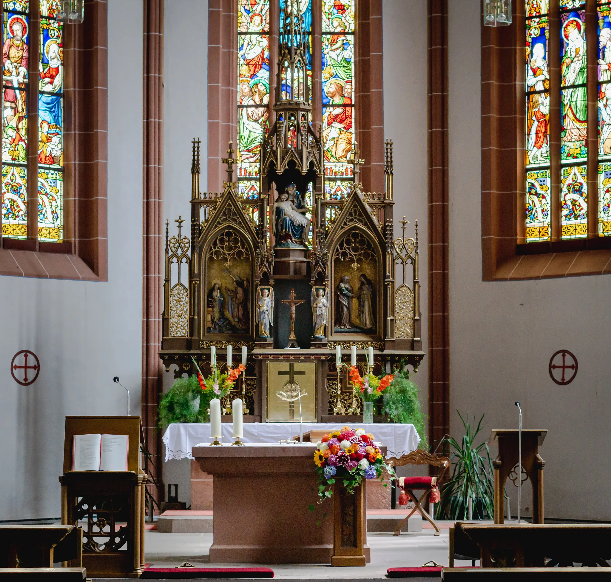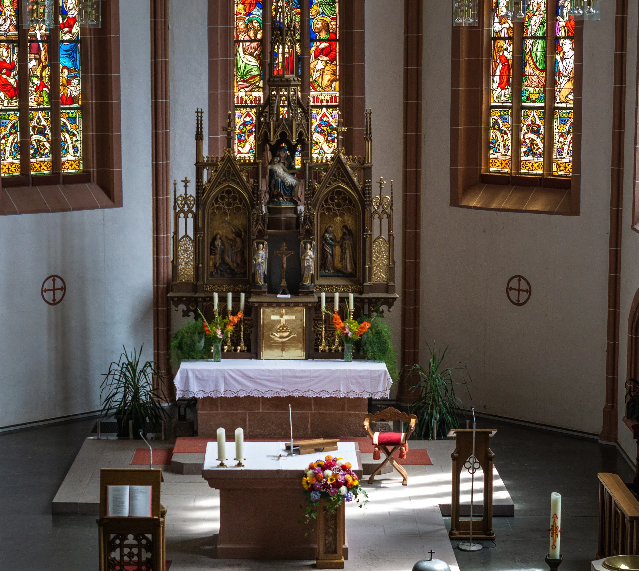 Die Fenster im Chor zeigen in der Mitte die Himmelfahrt Mariens (Patronat der Kirche) links die hl. Familie und rechts die hl. Elisabeth, Landgräfin von Hessen.