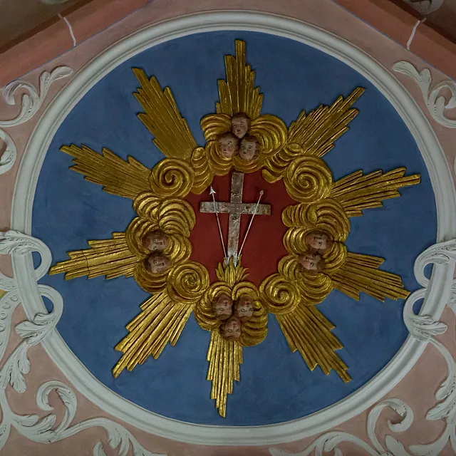 Außerhalb der Kirche sehen wir einen Bildstock aus dem 18. Jahrhundert mit dem auferstandenen Christus im Medaillon. Der Bildstock ist vor einiger Zeit renoviert worden und die Inschrift vergoldet: "Kommt alle zu mir, die ihr mühselig und beladen seid, ich will euch erquicken" (Mt 11,28)